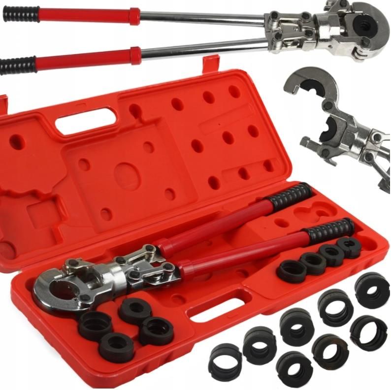 Ręczna praska hydrauliczna do zaciskania złączek na rurach PEX W zestawie razem z 8 matrycami Zaciskarka wyposażona jest w siłownik hydrauliczny pozwalający precyzyjnie i szczelnie zacisnąć złączki z odpowiednią siłą. Głowica obrotowa 360° umożliwia pracę w trudno dostępnych miejscach zwiększając poręczność i uniwersalność praski. Teleskopowe rękojeści umożliwiające zmianę długości co pozwala na zmniejszenie siły koniecznej do zakucia złączki. Możliwość szybkiej zmiany matryc pozwala znacznie przyspieszyć prace. W zestawie z zaciskarką komplet najpopularniejszych rozmiarów matryc Typu U: 16 mm 20 mm 25 mm 32 mm Oraz matryc Typu TH 16 mm 20 mm 26 mm 32 mm Uniwersalność i wszechstronność zastosowań W zestawie komplet najpopularniejszych matryc umożliwia dobranie odpowiedniej matrycy do potrzeb. Dodatkowo obracana głowica o 360 stopni oraz regulowana długość ramion pozwalają uzyskać dostęp do miejsc z ciężkim podejściem. Zawartość zestawu zaciskarka matryce typu U: 16 mm / 20 mm / 25 mm / 32 mm matryce typu TH: 16 mm / 20 mm / 26 mm / 32 mm poręczna walizka z uchwytem Obracana głowica o 360 stopni