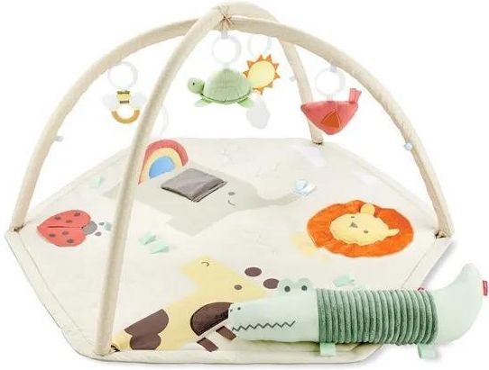 Skip Hop Mata Edukacyjna Geometryczny Świat Numer kat. 9R257810 Mata do zabawy z motywem zwierząt ale w nietypowych geometrycznych kształtach. Dzięki nowoczesnej i przemyślanej stylistyce mata stanowi przestrzeń do zabawy ale także nauki. Dołączone do maty sensoryczne zabawki stymulują rozwój niemowlaka a pogodne zwierzątka w różnych kształtach uczą kolorów i kształtów starszego dziecka dzięki czemu mata może posłuźyć na dłużej. Wysokokontrastowe obrazki, zróżnicowane faktury i delikatne dźwięki pomagają stymulować zmysły Twojego dziecka, a odłączane zabawki zapewniają dodatkową zabawę zarówno na macie, jak i poza nią. Ponadto neutralna, miękka paleta kolorów pięknie komponuje się z każdym domem — dzięki czemu jest to wygrana zarówno dla dziecka, jak i rodziców. Ta mata edukacyjna to wspaniały pomysł na prezent na baby shower! Główne zalety: - piekna kolorystyka i mnóstwo elementów stymulujących rozwój malucha, - 5 różnych zawieszek oraz krokodyl - poduszka do leżenia na brzuszku, - mata edukacyjna wyposażona jest w: żółwia - grzechotkę z lusterkiem, słoneczko - piszczek z gryzakiem w kształcie chmurki, trójkątny ptaszek - grzechotka z metkami do chwytania, pszczółka - drewniany gryzak, tęcza- szeleszczący materiał łatwy do chwytania, - wystajce elemety na macie szeleszczą mają różne tekstury bądź też umożliwją zabawe w odkrywanie (jak skrzydełka biedronki), - mata zapewnia wygodę i wiele tekstur sprzyjających rozwojowi zmysłów dziecka, Wymiary: - długość: 95 cm - szerokość: 85 cm - wysokość: 45 cm Pielęgnacja oraz ostrzeżenia: Wymaga montażu przez osobę dorosłą. Poduszka i mata: Pranie w pralce; Suszyć na płasko; Nie czyścić chemicznie. Wszystkie zabawki i łuki: Tylko do czyszczenia punktowego; Nie zanurzać w wodzie. Wiek: od 0 lat Płeć: chłopiec/dziewczynka Materiał: poliester Kolor: wielokolorowy