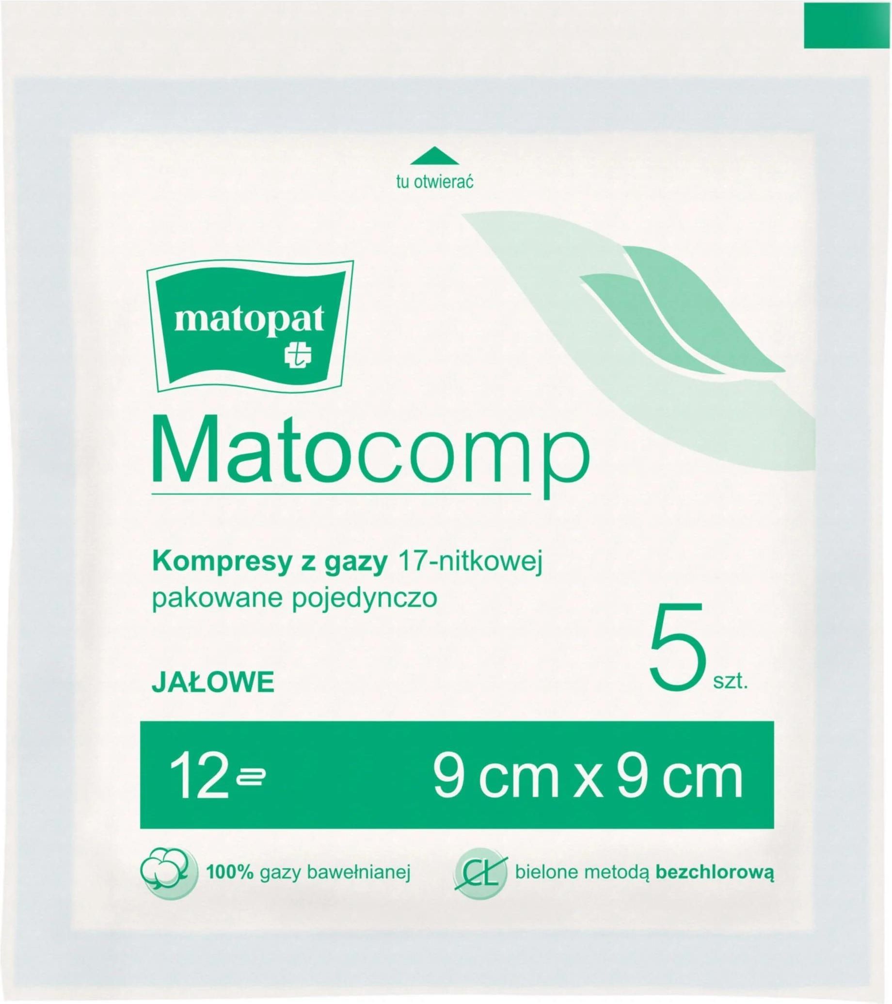 Opis: Matocomp Kompresy jałowe z gazy 17 nitkowe 12 warstwowe 9 x 9 cm Matocomp Kompresy jałowe z gazy 17 nitkowe 12 warstwowe 9 x 9 cm to wyrób medyczny do stosowania jako opatrunek podczas procedur ambulatoryjnych oraz operacji, skutecznie chłonący płyny. W praktyce lekarskiej: dla pielęgniarek i lekarzy wykonujących zabiegi diagnostyczne z udziałem płynów ustrojowych oraz krwi. W opiece długoterminowej: dla opiekunów do pochłaniania płynów, wilgoci i krwi przy zmianie opatrunku. W kosmetyce: dla kosmetyczek do celów higieniczno-kosmetycznych oraz do przemywania ciała po zabiegu. W domu: dla dorosłych i dzieci, do przemywania i opatrywania ran, skaleczeń i otarć oraz jako wkład chłonny zabezpieczający wilgotną ranę. .Skład: Co zawiera Matocomp Kompresy jałowe z gazy 17 nitkowe 12 warstwowe 9 x 9 cm? Kompresy wykonane ze 100% gazy bawełnianej..Charakterystyka produktu: Bielone metodą bezchlorową dla większej bezpieczeństwa. Nie pozostawiają włókien na powierzchni. Krawędzie zagięte do środka produktu. Charakteryzują się wysoką absorpcją wilgoci i cieczy. Opakowanie peel-pack umożliwia otwarcie bez pyłu, z efektem łatwego odrywania. .Sposób użycia: Jak stosować Matocomp Kompresy jałowe z gazy 17 nitkowe 12 warstwowe 9 x 9 cm? Kompresy z gazy opatrunkowej są wyrobem jednorazowym. Podczas procedur inwazyjnych należy je stosować jedynie w stanie nierozwiniętym..Dodatkowe: Opakowanie: 5 sztuk.Ostrzeżenia: To jest wyrób medyczny. Używaj go zgodnie z instrukcją używania lub etykietą. Wyrób jednorazowego użytku. Wyrób sterylny, nie używać powtórnie, nie resterylizować, do użytku ambulatoryjnego, nie używać, jeśli opakowanie jest uszkodzone, trzymać z dala od światła słonecznego, chronić przed wilgocią. .