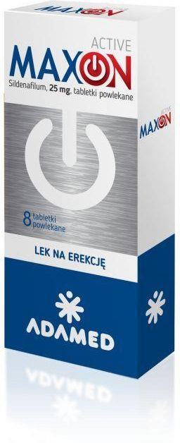 Lek Maxon Active jest stosowany w leczeniu zaburzeń wzwodu u dorosłych mężczyzn, czyli impotencji. Jest to niemożność uzyskania lub utrzymania erekcji prącia wystarczającej do odbycia stosunku płciowego. Maxon Active zawiera substancję czynną – syldenafil, który należy do leków z grupy inhibitorów fosfodiesterazy typu 5. Lek działa poprzez wspomaganie rozkurczu naczyń krwionośnych w prąciu, zwiększając napływ krwi do prącia podczas podniecenia seksualnego. Maxon Active pomaga osiągnąć wzwód jedynie pod warunkiem uprzedniego pobudzenia seksualnego. DAWKOWANIE/SPOSÓB UŻYCIA: Zalecaną dawką jest 25mg syldenafilu przyjmowane w zależności od potrzeb około godzinę przed planowaną aktywnością seksualną. Nie zaleca się stosowania produktu leczniczego częściej niż raz na dobę. Jeżeli produkt leczniczy Maxon Active jest przyjmowany podczas posiłku, początek działania produktu leczniczego może być opóźniony w porównaniu do przyjęcia produktu leczniczego na czczo. W przypadku, gdy o zastosowaniu leczenia farmakologicznego decyduje lekarz, może on zalecić dawkę 50mg syldenafilu, przyjmowaną w zależności od potrzeb około godzinę przed planowaną aktywnością seksualną. W zależności od skuteczności i tolerancji produktu leczniczego lekarz może dawkę zwiększyć do 100mg lub zmniejszyć do 25mg. Przeciwwskazania: uczulenie na syldenafil lub którykolwiek z pozostałych składników tego leku. Nie stosować:  jeśli pacjent przyjmuje azotany, ponieważ ich jednoczesne przyjmowanie może prowadzić do niebezpiecznego zmniejszenia ciśnienia tętniczego; jeśli pacjent przyjmuje leki uwalniające tlenek azotu (takie jak azotyn amylu, tzw. poppers), ponieważ ich jednoczesne przyjmowanie może również prowadzić do niebezpiecznego zmniejszenia ciśnienia tętniczego; jeśli pacjent przyjmuje riocyguat; jeśli u pacjenta stwierdzono ciężkie choroby serca lub wątroby; jeśli u pacjenta niedawno wystąpił udar lub zawał serca oraz w przypadkach niskiego ciśnienia tętniczego krwi; jeśli u pacjenta występują dziedziczne zmiany degeneracyjne siatkówki, takie jak zwyrodnienie barwnikowe siatkówki (retinitis pigmentosa); jeśli u pacjenta stwierdzono kiedykolwiek utratę wzroku w wyniku niezwiązanej z zapaleniem tętnic przedniej niedokrwiennej neuropatii nerwu wzrokowego. Ostrzeżenia i środki ostrożności: przed rozpoczęciem przyjmowania leku Maxon Active należy omówić to z lekarzem lub farmaceutą w przypadku: niedokrwistości sierpowatokrwinkowej (nieprawidłowość dotycząca czerwonych ciałek krwi), białaczki (choroba nowotworowa krwi), szpiczaka mnogiego (choroba nowotworowa szpiku kostnego); jeśli u pacjenta stwierdzono anatomiczne zniekształcenie prącia lub chorobę Peyroniego; dolegliwości ze strony serca; choroby wrzodowej lub zaburzeń krzepnięcia (jak hemofilia); jeśli wystąpi nagłe pogorszenie widzenia lub nagła utrata wzroku, należy przerwać stosowanie leku Maxon Active i natychmiast skontaktować się z lekarzem.