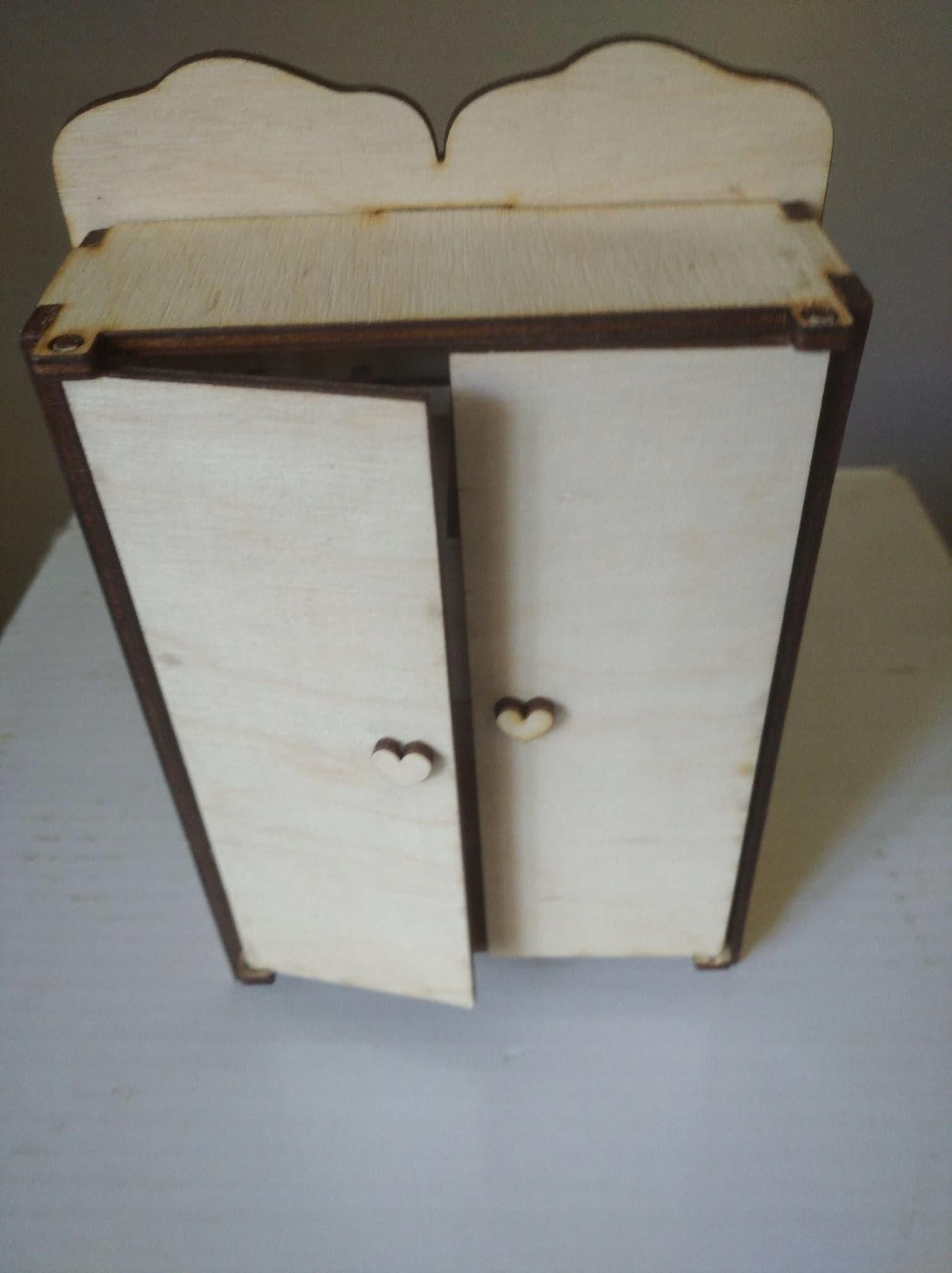 Unikalna otwierana szafa wys ok 19cm szer. 12,5cm głębokość 5cmwykonana ze sklejki gr 4mm i posklejane klejem co czyni ją boradzi wytrzymalą.Gratis dodajemy 6 szt wieszaków na których można powiesić ubranka swojej lalki a na dolnej półce poukładać obuwie