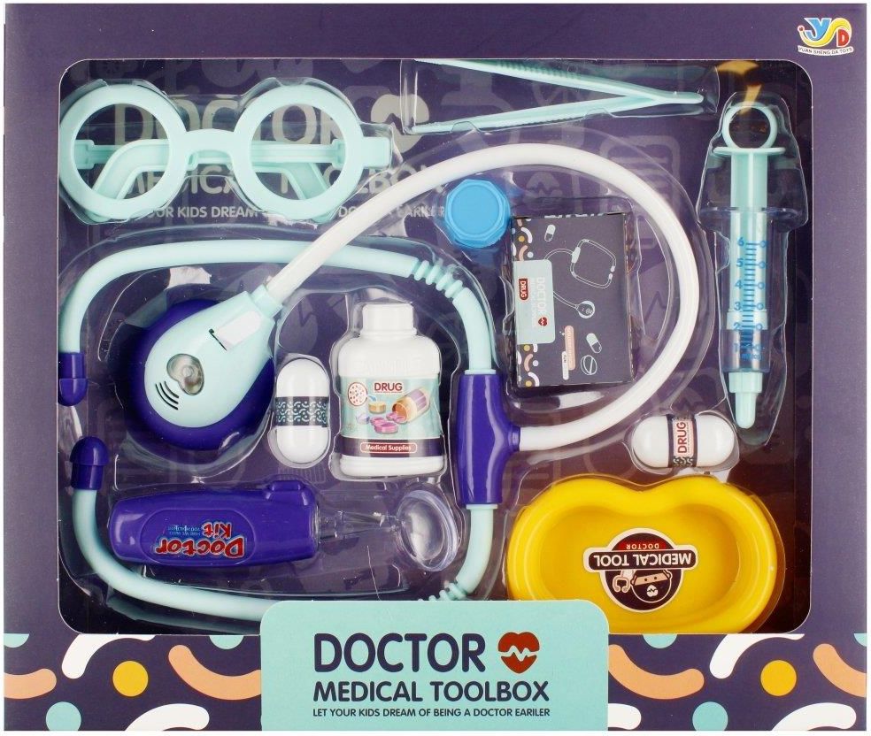 Mega Creative Zestaw Lekarski 532526 MEGA CREATIVE przedstawia Zestaw Lekarski ze wszystkimi niezbędnymi przyrządami lekarskimi. Z tym zestawem, wszyscy pacjenci zostaną wyleczeni! Zalety produktu: pobudza wyobraźnie dziecka, nauka opieki nad chorym, rozwija kreatywność dziecka. Zestaw posiada efekty dźwiękowe oraz świetlne - stetoskop posiada odgłos bicia serca oraz pulsującą czerwoną lampkę. Zawartość zestawu: stetoskop - 52x13 cm miska na narzędzia lusterko ze światłem okulary strzykawka pęseta butelka z lekami opakowanie na leki 2x pigułki Całość wykonana z plastiku oraz kartonu. wymiary opakowania - 30x25x4 cm waga produktu bez opakowania - 0,14 kg wymaga zasilania bateriami 5 x AG10 - załączono do zestawu Zestaw przeznaczony dla dzieci w wieku: 3+.