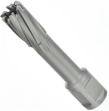 Wiertła koronowe z ostrzami z węglików spiekanych zapewniają czyste cięcie, szybki posuw i mniej wibracji. Przy obróbce standardowych materiałów wykazują podwójną żywotność w porównaniu z wiertłami HSS. ZASTOSOWANIE GŁÓWNE: stal zwykła i stopowa (o wytrzymałości do 1100N/mm2) stal nierdzewna aluminium i jego stopy mosiądz brąz żeliwo tworzywa sztuczne ZASTOSOWANIE OPCJONALNE: stal zwykła i stopowa (o wytrzymałości do 1300N/mm2) stop tytanu Wiertła trepanacyjne najlepiej sprawdzą się z pilotem prowadzącym, który spełnia kilka funkcji: funkcja pozycjonująca umożliwia dopływ cieczy chłodzącej do środka wierconego otworu wypycha pozostałą część materiału z wnętrza wiertła trepanacyjnego ROZMIAR UCHWYTU MOCUJĄCEGO: Frezy >Ø 60: WELDON 32mm (1.1/4") Frezy <Ø 60: WELDON 19mm (3/4") Frezy w rozmiarze Ø 60, 62, 65 mm: oferujemy w dwóch wariantach Istnieje możliwość dokupienia redukcji z weldon 32mm na weldon 19mm