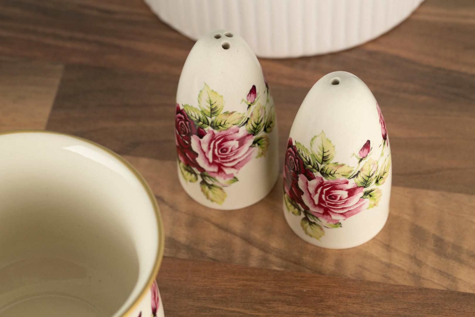 Solniczka i pieprzniczka w kolorze kremowym. Ozdobione motywem róży. Wykonany z użytkowej ceramiki szlachetnej. Wyprodukowany w Polsce przez fabrykę ceramiki szlachetnej w Mieroszowie. Ceramikę można myć w domowych zmywarkach. Wzór: róże (produkt został wykonany ręcznie. Układ kalki oraz malowania …