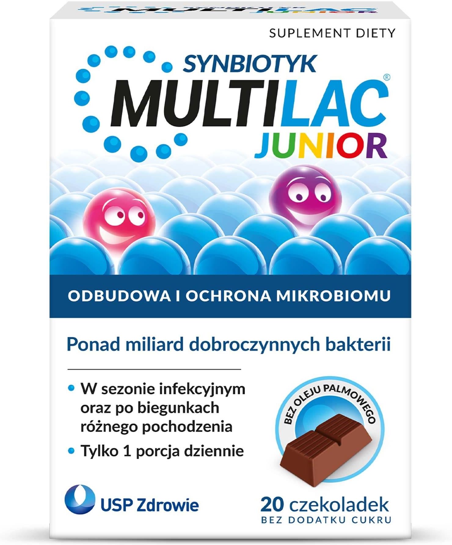 RODZAJ REJESTRACJI:suplement diety PRODUCENT: USP Zdrowie ILOŚĆ: 20 czekoladek Multilac Junior jest synbiotykiem w formie czekoladek. Synergia probiotyku i kakao do odbudowy i ochrony mikrobiomu dziecka Najwyższa zawartość dobroczynnych bakterii w 1 czekoladce! Tylko 1 porcja dziennie Bez dodatku cukru i oleju palmowego ZASTOSOWANIE: Odbudowa mikrobiomu po infekcjach wirusowych, takich jak rotawirusowe. W trakcie stosowania antybiotyków lub leków na infekcje z grupy NLPZ. Wspomagająco w sezonie jesienno-zimowym. Po biegunkach różnego pochodzenia. ZALECANA PORCJA DO SPOŻYCIA: Dzieci powyżej 3 r.ż.: 1 czekoladka dziennie. Każda czekoladka zapakowana jest w osobną folię barierową Składniki1 czekoladka (dzienna porcja) Bifidobacterium lactis HN019TM 1,00 x 109 CFU* Lactobacillus rhamnosus HN001TM 1,00 x 108 CFU* Inulina 292 mg *CFU - Colony Forming Unit - jednostka tworząca kolonię SKŁAD: substancja słodząca: maltitol; masa kakaowa; masło kakaowe; inulina; emulgator: lecytyny sojowe; Bifidobacterium lactis HN019™; naturalny aromat waniliowy; substancja słodząca: glikozydy stewiolowe ze stewii; Lactobacillus rhamnosus HN001™ Przechowywanie: w zamkniętym opakowaniu, w suchym miejscu, w temperaturze 15-25 st. Celsjusza, w sposób niedostępny dla małych dzieci. Chronić przed światłem. Ostrzeżenie: Nie przekraczać zalecanej porcji dziennej. Suplement diety nie może być stosowany jako substytut zróżnicowanej diety. Nie stosować w przypadku uczulenia na którykolwiek ze składników preparatu. Nie zaleca się stosowania preparatu u kobiet w ciąży i karmiących piersią. Dla zachowania prawidłowego stanu zdrowia duże znaczenie ma zbilansowana i zróżnicowania dieta oraz zdrowy tryb życia. Nie stosować w przypadku nadwrażliwości/alergii na którykolwiek ze składników preparatu. Przed użyciem zapoznaj się z treścią ulotki dołączonej do opakowania bądź skonsultuj się z lekarzem lub farmaceutą, gdyż każdy preparat niewłaściwie stosowany zagraża Twojemu życiu lub zdrowiu.
