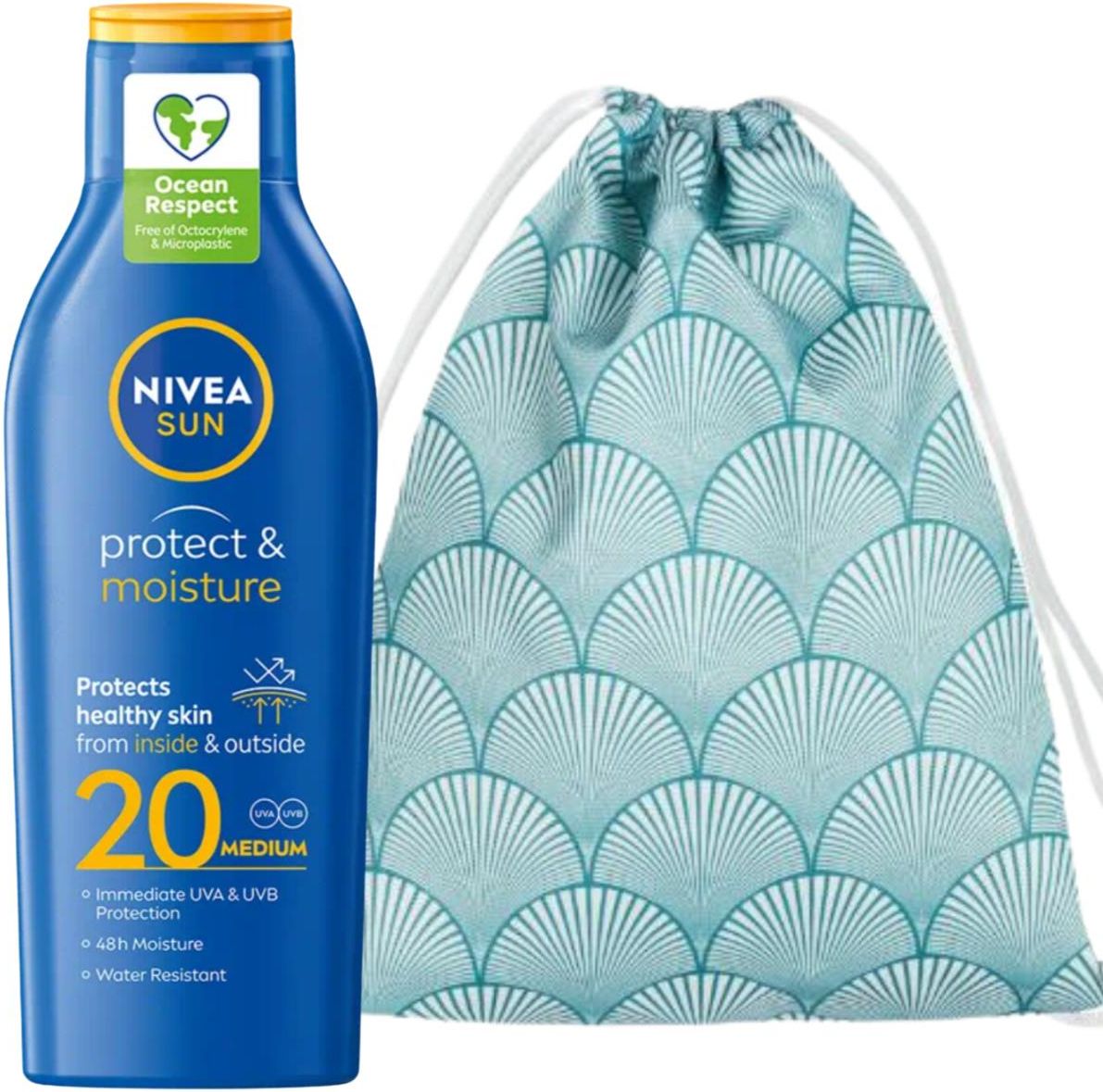 Nivea Protect & Moisture SPF20 Balsam + Plecak PlażowyNIVEA SUN Protect & Moisture Balsam do opalania SPF 20 chroni zdrową skórę z zewnątrz i pielęgnuje wewnątrz. Zapewnia natychmiastową ochronę przed promieniowaniem UV i zapobiega utracie wilgotności skóry wewnątrz dzięki antyoksydacyjnej witaminie E. Utrzymuje skórę nawilżoną przez 48h. Wodoodporna formuła jest w 84% biodegradowalna, a zastosowana formuła Ocean Respect nie zawiera filtrów UV Octinoxate, Oxybenzone, Octocrylene i jest wolna od mikroplastiku. Opakowanie produktu w 50% pochodzi z recyklingu (bez etykiety).Ostrzeżenie:Nałożenie mniejszej ilości produktu istotnie obniża poziom ochrony. Unikaj zbyt długiego przebywania na słońcu, nawet po zastosowaniu ochrony przeciwsłonecznej. Produkty ochrony przeciwsłonecznej nie zapewniają 100% ochrony. Nadmierne przebywanie na słońcu stanowi poważne zagrożenie dla zdrowia. Chroń niemowlęta i małe dzieci przed bezpośrednim działaniem promieni słonecznych. . Tolerancja dla skóry potwierdzona dermatologicznie.Najważniejsze cechy produktuChroni zdrową skórę z zewnątrz i pielęgnuje wewnątrzNiezawodna ochrona- natychmiastowa ochrona przed promieniowaniem UVA i UVB, oparzeniami słonecznymi i przedwczesnym starzeniem się skóryWodoodporna formułaPielęgnuje skórę wewnątrz dzięki antyoksydacyjnej witaminie E.48-godzinne nawilżenie dla skóryZrównoważony rozwój- Formuła Ocean Respect wolna od szkodliwych dla środowiska filtrów UV Octinoxate, Oxybenzone, Octocrylene i nie zawiera mikroplastiku.Nivea Plażowy Plecak MuszelkiOryginalny plecak worek ozdobiony z napisem Nivea. Wykonany z materiału, wytrzymałego i odpornego na rozerwanie. Wygodny plecak na miasto lub plażę, który pomieści niezbędne rzeczy.