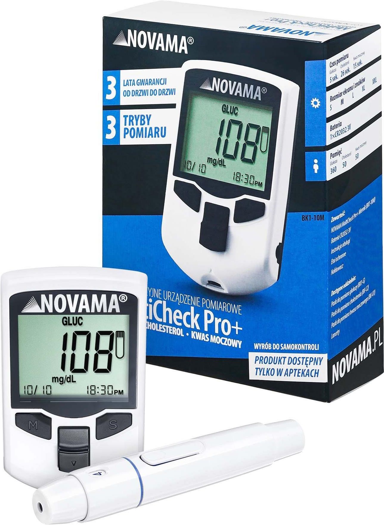 Miernik wielofunkcyjny NOVAMA MULTICHECK PRO+  Nie od dziś wiadomo, że lepiej zapobiegać niż leczyć, ale jak to zrobić? Ograniczony dostęp do lekarzy specjalistów, ciągłe kolejki i ogromne koszty leczenia nie zachęcają do wizyt w jednostkach służby zdrowia. Na szczęście teraz możesz mieć najważniejsze parametry krwi pod kontrolą bez wychodzenia z domu! Regularny pomiar poziomu glukozy, cholesterolu i kwasu moczowego może ułatwić ci zahamowanie rozwoju najczęściej występujących chorób cywilizacyjnych. Badania krwi: glukoza, cholesterol i kwas moczowy. To jedne z ważniejszych parametrów, które powinny być regularnie kontrolowane u wszystkich osób po 30 roku życia. Badanie stężenia glukozy, cholesterolu i kwasu moczowego może umożliwić wczesne wykrycie najczęściej występujących chorób takich jak cukrzyca, choroby układu krążenia czy dny moczanowej. Multicheck Pro+ w twoim domu to gwarancja stałego dostępu do podstawowych badań, które mogą w porę ostrzec przed niekorzystnymi dla zdrowia parametrami. Szybka weryfikacja poziomu glukozy, cholesterolu i kwasu moczowego daje szanse na wczesne wdrożenie odpowiedniej diety i aktywności, która nie dopuści do rozwoju najczęściej występujących chorób cywilizacyjnych. Parametry odbiegające od norm sygnalizują konieczność wizyty u lekarza specjalisty. Funkcja glukometru Pomiar zawartości glukozy w kapilarnej krwi pełnej pobranej z palca, dłoni lub przedramienia. Pamięć – 360 wyników Wyliczanie średniej z 7, 14, 21 i 28 dni Zakres pomiarowy 20-600 mg/dL (1,1–33,3 mmol/L) Multichceck PRO+ to profesjonalne urządzenie polecane dla pracowników służby zdrowia, ale także dla wszystkich osób obciążonych chorobami cywilizacyjnymi takimi jak cukrzyca, dna moczanowa, hipercholesterolemia. Polecane jest również pacjentom obciążonym genetycznie chorobami które mają związek z poniesionym poziomem glukozy, cholesterolu lub kwasu moczowego. Pomiaru cholesterolu Pomiar całkowitego poziomu cholesterolu w kapilarnej krwi pełnej pobranej z palca/ krwi żylnej/ krwi tętniczej. Zakres pomiarowy 100-400 mg/dL (2,59-10,35 mmol/L) Pamięć – 50 wyników Pomiar kwasu moczowego Pomiar całkowitego poziomu kwasu moczowego w kapilarnej krwi pełnej pobranej z palca/ krwi żylnej/ krwi tętniczej. Zakres pomiarowy 3-20 mg/dL (0,18–1,19 mmol/L) Pamięć – 50 wyników Multichcek Pro+ to wielofunkcyjny miernik wskazujący poziom glukozy, cholesterolu i kwasu moczowego. Do wykonania pomiaru urządzenie wykorzystuje metodę elektrochemicznej technologii bio-sensorycznej. Czas pomiaru to tylko 15 sekund! Wbudowany wyrzutnik pasków - gwarancja bezpieczeństwa i higieny!  Wielofunkcyjny miernik MulitiCheck Pro+ ma wbudowany wyrzutnik pasków, który umożliwia higieniczne usunięcie paska z krwią bez konieczności jego dotykania. Po wykonaniu badania możesz usunąć pasek za pomocą jednego przycisku. Takie rozwiązanie gwarantuje bezpieczeństwo i higienę użytkowania zgodnie z obowiązującymi przepisami sanitarnymi. Oprócz tego, że wielofunkcyjny miernik MultiCheck Pro+ umożliwia dokonanie precyzyjnych badań w zaciszu swojego domu to dodatkowo jest bardzo proste w obsłudze. Intuicyjna obsługa i przejrzysty ekran to cechy, które na pewno docenią seniorzy. Prosta konstrukcja i tylko trzy przyciski. Szybki pomiar bez wychodzenia z domu, bez kolejek w przychodni i wizyt u lekarza po skierowanie na badania.  Łatwe badanie krwi dla seniorów! Funkcja Auto Strip Recognition czyli funkcja automatycznego rozpoznawania paska. Po zakodowaniu miernika i włożeniu paska urządzenie automatycznie przełączy się na odpowiedni tryb pomiarowy. Urządzenie poinformuje o źle wprowadzonym pasku, słabej baterii czy niewystarczającej ilości próbki krwi. Do wykonania badania potrzebne będą: Urządzenie MultiCheck Pro+, paski testowe, nakłuwacz, lancety, chusteczka lub wacik nasączone płynem odkażającym miejsce pobierania próbki.