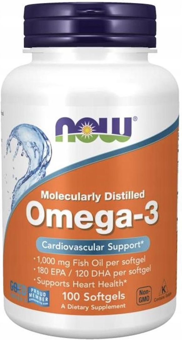 . Now Foods Omega 3 100Kaps Now Foods Omega-3 jest suplementem diety, który pozwala na skuteczne uzupełnianie codziennej diety w kwasy tłuszczowe z grupy Omega-3: kwas EPA i DHA. Adresowany jest do osób powyżej 18. roku życia. Omega-3 Now Foods to suplement diety, który jest naturalnym koncentratem oleju rybiego, będącego cennym źródłem kwasów tłuszczowych Omega-3, w tym: kwasu eikozapentaenowego oraz kwasu dokozaheksaenowego. Nienasycone kwasy tłuszczowe Omega-3 odgrywają istotna rolę w utrzymaniu zdrowia organizmu. Powstają z nich substancje (prostaglandyny), które regulują pracę układu krążenia, systemu odpornościowego i gospodarkę tłuszczową. Kwasy omega-3 oddziałują również regulacyjnie na poziom cholesterolu i trójglicerydów. Stosowanie ich przez kilka miesięcy znacząco niweluje poranną sztywność stawów oraz podnosi odporność organizmu. Kwasy EPA i DHA sprzyjają też prawidłowemu funcjonowaniu serca. Korzystne działanie występuje w przypadku spożywania 250 mg EPA i DHA dziennie. Zalecane spożycie 2 kapsułki 1-3 razy dziennie podczas posiłku. Składniki Koncentrat oleju rybiego, witamina E (pozyskana z soi), materiał kapsułki: żelatyna, substancja wypełniająca: sliceryna, woda oczyszczona.