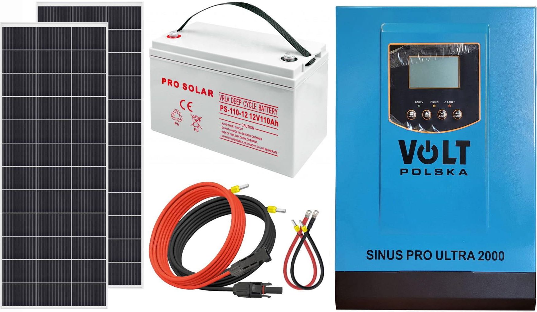 Do każdego zakupionego zestawu, dołączona jest szczegółowa instrukcja, oraz schemat montażu. Specyfikacja: Producent: Volt Polska Materiał ogniwa Monokrystaliczny Moc maksymalna Pmax (W): 220W Tolerancja (%): ± 3% Napięcie obwodu otwartego Voc (V): 24,19 Napięcie przy mocy maksymalnej Vmp (V): 20,16 Prąd przy mocy maksymalnej Imp (A): 9,92 Prąd zwarciowy Isc (A): 10,71 Prąd nominalny bezpiecznika (A): 15 Klasa ochronności: IP63 Maksymalne napięcie układu paneli (V): DC1000 Zakres temperatury pracy: -40°C - 85°C Wymiar: 1480 x 670 x 35 x 30 mm Waga: 15 kg Kolor ramy: Srebrny Tył Modułu (Backsheet): Biały Ilość w zestawie: 2 panele Gwarancja: 24 miesiące Kod produktu: 27249 Kod zestawu: 27294 Panel fotowoltaiczny monokrystaliczny Volt Polska 220W MONO posiada ogniwa typu wykonane z pojedynczego kryształu krzemu. Monokrystaliczny panel fotowoltaiczny firmy Volt Polska to większa sprawność, dzięki której do wytworzenia tej samej ilości energii wystarczy mniejsza liczba paneli. Tym samym moduły monokrystaliczne w porównaniu do polikrystalicznych pozwalają oszczędzić więcej przestrzeni. Panel jest pokryty laminowaną folią EVA. Wodoodporny, idealny do instalacji w układach. Przewody o długości ok 90 centymetrów wychodzące z panelu, zarobione złączami MC4. Gwarancja jakości: Test izolacji elektrycznej Test odporności na warunki zewnętrzne Test gorącego punktu (Hot-spot) Test odporności na promienie UV Test wytrzymałości na zmiany temperatury, uderzenia gradu Test odporności na wilgoć Test wytrzymałości Test odporności na obciążenia mechaniczne Inwerter solarny Volt Polska SINUS PRO ULTRA 2000 Producent: Volt Polska Moc całkowita (chwilowa): 2000VA Moc stała: 1000W Napięcie akumulatora: 12VDC Zakres napięcia wejściowego (panel fotowoltaiczny): 15VDC-105VDC Maksymalny prąd ładowania z układu paneli: Imp do 60A Max prąd ładowania: 70A Zakres napięcia wejściowego (zasilanie sieciowe): 170VAC-280VAC Zakres napięcia wyjściowego (zasilanie sieciowe): 220VAC-240VAC Prąd ładowania z sieci: 10/20A Zakres napięcia wyjściowego (przetwornica): 230V+-3% Temperatura pracy: 0-40°C Wymiary: 224 x 337 x 97 mm Waga: 5 kg Gwarancja: 24 miesiące Kod produktu: 22556 Opis produktu Inwerter solarny SINUS PRO ULTRA 2000 to urządzenie łączące w sobie kilka funkcji: inwertera, ładowarki solarnej oraz ładowarki do akumulatorów. Czytelny wyświetlacz LCD pozwala na prostą i intuicyjną obsługę za pomocą przycisków dla ustawień takich jak: prąd ładowania akumulatora, priorytet AC/ładowarki słonecznej, dopuszczalne napięcie wejściowe w zależności od różnych zastosowań. Na wyjściu inwerterów, przetwarzających napięcie nie należy stosować żadnych form bezpieczników, również listw antyprzepięciowych, czyli popularnych rozdzielaczy z zabezpieczeniem. Jedyną bezpieczną formą zabezpieczenia układu jest założenie bezpiecznika po stronie akumulatora a jedyną dozwoloną formą rozdzielenia z gniazd sieciowych jest zastosowanie podstawowego rozdzielacza, pozbawionego zabezpieczeń, diod oraz przełączników. Co wyróżnia zasilacz SINUS PRO ULTRA 2000 na tle innych urządzeń? Wbudowana przetwornica typu czysty SINUS wytwarza na wyjściu napięcie o „przebiegu sinusoidalnym”, takie samo jak w sieci energetycznej. Dzięki temu, może zasilać urządzenia o charakterze indukcyjnym (m.in. elektronarzędzia siłowe, sprężarki powietrza, klimatyzatory, lodówki, zamrażarki etc.). Najważniejsze cechy: Czysty SINUS Konfigurowalny zakres napięcia wejściowego dla sprzętu gospodarstwa domowego i komputerów za pomocą ustawień wyświetlacza LCD Konfigurowalny prąd ładowania akumulatora w zależności od zastosowania, dzięki ustawieniom wyświetlacza LCD Konfigurowalny priorytet AC/ładowania solarnego, dzięki ustawieniom wyświetlacza LCD Kompatybilność z napięciem sieciowym lub mocą generatora Automatyczne ponowne uruchomienie podczas przywracania zasilania AC Zabezpieczenie przeciw zwarciowe, przeciw przeciążeniowe i termiczne Nowoczesna konstrukcja ładowarki zapewnia optymalne ładowanie akumulatora Funkcja zimnego startu Jakie urządzenia zasila SINUS PRO ULTRA 2000? Urządzenia RTV np. telewizory, tunery, hi-fi, dvd Urządzenia AGD np. lodówki, mikrofalówki, blendery, opiekacze Urządzenia biurowe np. drukarki, faksy, komputery, monitory Elektronarzędzia np. wiertarki, szlifierki, kątówki Pompy, sprężarki Akumulator Volt Polska DEEP CYCLE VPRO SOLAR 12V 110Ah VRLA Producent: Volt Polska Napięcie nominalne: 12V Pojemność nominalna: 110Ah Wysokość całkowita: 218 mm Rezystancja wewnętrzna (przy 25°C): 4,5 mΩ Wysokość: 213 mm Szerokość: 173 mm Długość: 331 mm Waga:28,6 kg Zalecana temp robocza: 25°C±3°C Maksymalny prąd ładowania: 30A Maksymalny prąd rozładowania: 1000A Projektowana żywotność (25°C): 5-8 lat Gwarancja: 24 miesiące Kod produktu: 21112 Opis produktu Akumulator z serii DEEP CYCLE jest przeznaczony m.in. do zasilania systemów energii słonecznej i wiatrowej, kamperów, systemów zasilania awaryjnego (zasilacze UPS, automatyka). Został zaprojektowany i skonstruowany w taki sposób, aby mógł ulegać głębokiemu rozładowaniu, zanim zacznie proces ponownego ładowania. Najważniejsze cechy: Posiada wzmocnioną konstrukcję z płytami ołowiowymi, z aktywnymi materiałami o dużej gęstości oraz nieco mocniejszym elektrolitem niż standardowe akumulatory. Dzięki temu może być stosowany w aplikacjach, w których pracuje cyklicznie Automatyczny system uszczelniania. W momencie zbyt wysokiego ciśnienia wewnątrz akumulatora, zawory otwierają się, powodując bezpieczne odprowadzenie powstałego gazu na zewnątrz obudowy i zapobiegają uszkodzeniu. Do takiej sytuacji dochodzi w momencie przeładowania akumulatora Obudowa akumulatora wykonana z materiału typu ABS, ogniwa z miedzi Jakie urządzenia zasila akumulator DEEP CYCLE? System energii słoneczne
