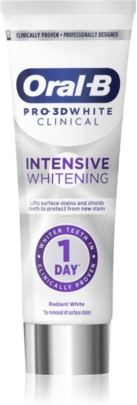 Oral B Pro-3D White Intensive Whitening, 75 ml, do wzmocnienia szkliwa dla mężczyzn, Pasta do zębów Oral B Pro-3D White Intensive Whitening jest przeznaczona do delikatnego wybielania zębów. Skutecznie usuwa niepożądane przebarwienia z zębów, a przy regularnym stosowaniu wynagradza bardziej promiennym uśmiechem. Właściwości: wybiela zęby walczy z próchnicą zębów i osadem nazębnym gwarantuje delikatną pielęgnację szkliwa zębów odpowiednia również dla osób z wrażliwymi zębami i dziąsłami dokładnie czyści zęby usuwa kamień i osad nazębny Sposób użycia: Wskazane jest stosowanie pasty co najmniej 2 razy dziennie, rano i wieczorem lub po każdym posiłku. Nanieś odpowiednią ilość pasty na szczoteczkę do zębów i myj zęby co najmniej przez 2 minuty. Dokładnie wypłucz usta.