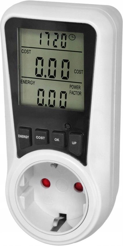 Podświetlany wyświetlacz LCD oferuje pełen wachlarz monitorowanych parametrów, takich jak napięcie sieci, prąd w obwodzie, częstotliwość prądu, współczynnik mocy POWER FACTOR, moc podłączonego obciążenia, całkowite zużycie energii w kWh, koszt zużytej energii, programowalną cenę 1 kWh, łączny czas …
