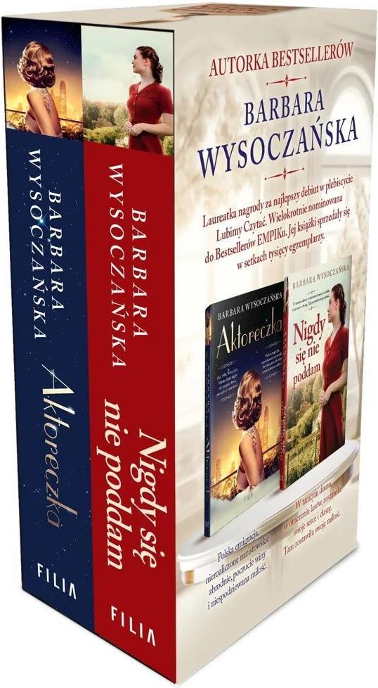 PAKIET 2X NIGDY SIĘ NIE PODDAM + AKTORECZKA Pakiet zawierający dwie książki autorstwa Barbary Wysoczańskiej. Nigdy się nie poddam Autor: Barbara Wysoczańska Data premiery: 2024-10-04 Rok wydania: 2024 ISBN: 9788383577548 Oprawa: Miękka ze skrzydełkami Wydawnictwo: Filia Liczba stron: 512 Wysokość: 20.5 cm Szerokość: 13.5 cm Waga: 0.448 kg Sygnatura: n18777 Stan: Nowa Tego roku winobranie było inne. W powietrzu czuć atmosferę wojny. Niby wszystkich rozpiera duma, że nasz naród jest wielki, że Führer jest wielki, ale ja się boję. Nie chcę wojny. Wolę mój mały świat, tu, w mojej winnicy, gdzie nie dociera zło. Bo nie mam wątpliwości, że (…) wojna jest złem najgorszym. Rok 1934 Gerhard Vogel, właściciel winnicy w Grünbergu na Śląsku, zapada na ciężką chorobę. Opiekę nad nim i rodzinnym interesem przejmuje jego córka Gretel. Wbrew żądaniom rodziny dziewczyna postanawia zachować winnicę i na wzór ojca uprawiać winorośl. Gdy Gretel walczy o swoją niezależność, na jej drodze stają bracia Hans i Erich Gehlerowie, obaj powiązani z nazistami oraz Hitlerem. Kiedy, w 1939 roku, wydaje się, że niepozornej dziewczynie ciężką pracą i determinacją uda się wreszcie odnieść sukces, wybucha wojna, która zmienia wszystko. Rok 2024 Po tragicznej śmierci męża Alicja kupuje zabytkowy dworek z winnicą pod Zieloną Górą. Odkrywa w nim starą skrzynkę, a w niej drobne przedmioty winiarskie i akt własności winnicy z lat trzydziestych. Zaintrygowana postanawia poznać historię miejsca, które kupiła, i spotyka się z Thomasem Ritterem, prawnukiem dawnej właścicielki Winnicy Vogel Aktoreczka Autor: Barbara Wysoczańska Data premiery: 2023-05-12 Rok wydania: 2023 ISBN: 9788382806847 Oprawa: Miękka Wydawnictwo: Filia Liczba stron: 492 Wysokość: 20.5 cm Szerokość: 13.5 cm Waga: 0.43 kg Stan: nowa Rok 1950, Nowy Jork. Miasto, które nigdy nie zasypia, sława, pieniądze i samotność. Polski fotograf Konrad Rogowski przebywający na emigracji w Nowym Jorku, usilnie stara się o opublikowanie zdjęć dokumentujących zbrodnie wojenne w Warszawie. Jednak jego najważniejszym celem jest znalezienie nazistowskiego zbrodniarza Rudolfa Schultego. Jedynym tropem dającym szansę na namierzenie byłego nazisty jest piękna i niezwykle sławna hollywoodzka gwiazda Lauren Evans. Splendor, skandale i światła jupiterów to jej świat. Otoczona luksusem i podziwiana, z pozoru żyje jak w bajce. Tymczasem w czterech ścianach wymarzonego apartamentu przy 5th Avenue boryka się z samotnością i strachem, że ktoś odkryje jej przeszłość i prawdziwą tożsamość. Czy cena sławy nie jest zbyt wysoka? Nie pasował do tej nowojorskiej socjety, do tego przejaskrawionego blichtru, którym otaczali się śmierdzący dolarami naśladowcy Rockefellera. Kiedy jednak poczuł mocniejszy uścisk palców Lauren na swoim ramieniu, zrozumiał, że ona – nie wiadomo dlaczego – naprawdę chce, żeby był tu z nią.