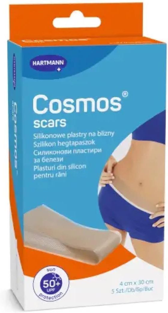 Opis: Hartmann, Cosmos Scar, Silikonowe plastry na blizny to wyrób medyczny przeznaczony do wspomagania leczenia świeżych blizn przerostowych oraz zapobiegania ich nadmiernemu rozrostowi.. Skład: Główne składniki plastrów z żelem silikonowym to: warstwa poliuretanu z benzotriazolem jako blokerem promieniowania UV (SPF), pokryta klejem z żelem silikonowym do zastosowań medycznych (usieciowany polimer dimetylosiloksanowy) oraz przezroczysta folia chroniąca stronę przylepną plastra.. Opis: Hartmann, Cosmos Scar, Silikonowe plastry na blizny to wyrób medyczny przeznaczony do wspomagania leczenia świeżych blizn przerostowych oraz zapobiegania ich nadmiernemu rozrostowi.. Skład: Główne składniki plastrów z żelem silikonowym to: warstwa poliuretanu z benzotriazolem jako blokerem promieniowania UV (SPF), pokryta klejem z żelem silikonowym do zastosowań medycznych (usieciowany polimer dimetylosiloksanowy) oraz przezroczysta folia chroniąca stronę przylepną plastra.. Przeznaczenie produktu: Wyrób medyczny przeznaczony do stosowania na blizny dla dzieci i dorosłych. . Zawartość opakowania: 5 sztuk silikonowych plastrów - 5 x 30 cm.Ochronny pojemnik do przechowywania. . Charakterystyka produktu: Plastry z żelem silikonowym są nieaktywnymi, nieinwazyjnymi, przeznaczonymi do jednorazowego użytku, niesterylnymi i samoprzylepnymi wyrobami, składającymi się z folii poliuretanowej pokrytej klejem z żelem silikonowym do zastosowań medycznych i przezroczystej folii ochronnej. Są one przeznaczone do stosowania jako pomoc w leczeniu świeżych blizn przerostowych i zapobieganiu nadmiernemu tworzeniu się blizn, takich jak blizny przerostowe i bliznowce u osób podatnych na bliznowacenie. Plastry chronią blizny przed promieniowaniem UV (50+). Plastry są przeznaczone do stosowania przez osoby bez przeszkolenia medycznego.. Sposób użycia wyrobu medycznego: Sposób stosowania:- Plaster można zastosować, gdy tylko rana się zamknie (brak krwi, wydzieliny lub strupów na skórze) i/lub szwy zostaną usunięte (np. w przypadku ran chirurgicznych). Stosowanie na starszych bliznach nie jest szkodliwe, ale mniej korzystne dla leczenia.- Otworzyć pudełko i wyjąć z niego instrukcję używania oraz opakowanie jednostkowe.- Przed nałożeniem i ponownym nałożeniem plastra należy przeczytać niniejszą instrukcję używania.- Umyć dłonie i nakładać plaster wyłącznie na suchą, czystą i nienatłuszczoną skórę. Należy unikać kontaktu kremów lub żeli z produktem, ponieważ mogą one powodować mniejszą przyczepność plastra.- Otworzyć (częściowo, jeśli to konieczne) opakowanie jednostkowe, wyjąć plaster i odkleić przezroczystą folię ochronną. W razie potrzeby plaster można przyciąć do odpowiedniego rozmiaru czystymi nożyczkami przed usunięciem przezroczystej folii ochronnej.- Usunąć przezroczystą folię ochronną i nałożyć odsłoniętą przylepną stronę plastra na bliznę. Lekkie przyciśnięcie i wymodelowanie brzegów plastra zapewnia jego optymalne przyleganie do skóry. Należy upewnić się, że plaster w pełni przykrywa bliznę.Zmiana i usuwanie plastra:- Plaster można usunąć (np. w celu oczyszczenia blizny i/lub kontroli blizny), a następnie ponownie nałożyć.- Plaster jest wodoodporny i może pozostać na skórze podczas kąpieli pod prysznicem.- Plaster powinien być noszony najlepiej przez 12-24 godzin dziennie.- Zaleca się codzienne zdejmowanie plastra, mycie go wodą z mydłem i pozostawienie do wyschnięcia przed ponownym nałożeniem.- Plaster należy umyć w przypadku zabrudzenia.- Ponownie nałożony plaster należy usunąć najpóźniej po 7 dniach używania lub w przypadku, gdy właściwości przyczepności nie są już wystarczające.- W przypadku przycięcia do odpowiedniego rozmiaru: przed otwarciem nowego plastra należy najpierw użyć przyciętego plastra, aby uniknąć potencjalnego zanieczyszczenia plastra.Przechowywanie:- Po zdjęciu plastra można go przechowywać w dołączonym plastikowym pudełku do czasu ponownego nałożenia. Podczas przechowywania w plastikowym pudełku należy ponownie nałożyć dodatkową przezroczystą folię ochronną na przylepną stronę plastra. . Ostrzeżenia i środki ostrożności: Szczególne środki ostrożności są wymagane u pacjentów ze schorzeniami dermatologicznymi, które zaburzają integralność skóry, np. z ciężkim trądzikiem lub łuszczycą.Przechowywać plastry w miejscu niedostępnym dla dzieci.Przeciwwskazania:- Nie stosować do leczenia gojących się ran, otwartych tkanek, otwartych ran lub ran z niepełną ponowną epitelializacją.Działania niepożądane:Reakcje niepożądane mogą wystąpić u pacjentów z uczuleniem lub nadwrażliwością na dowolny z materiałów składowych produktu. Możliwe działania niepożądane związane ze stosowaniem plastrów z żelem silikonowym to:- powierzchowne zakażenie rany- hiperpigmentacja- krosty- świąd/swędzenie- rumień- podrażnienie- kontaktowe zapalenie skóry/ wysypka (spowodowane czynnikami drażniącymi)- maceracja- sucha skóra- zapalenie mieszków włosowych Jeśli wystąpi maceracja lub wysypka, należy zdjąć plaster i pozwolić skórze na regenerację aż do ustąpienia objawu, a następnie kontynuować leczenie, stopniowo wydłużając czas leczenia. Jeśli objaw utrzymuje się, należy przerwać stosowanie i skonsultować się z lekarzem. .