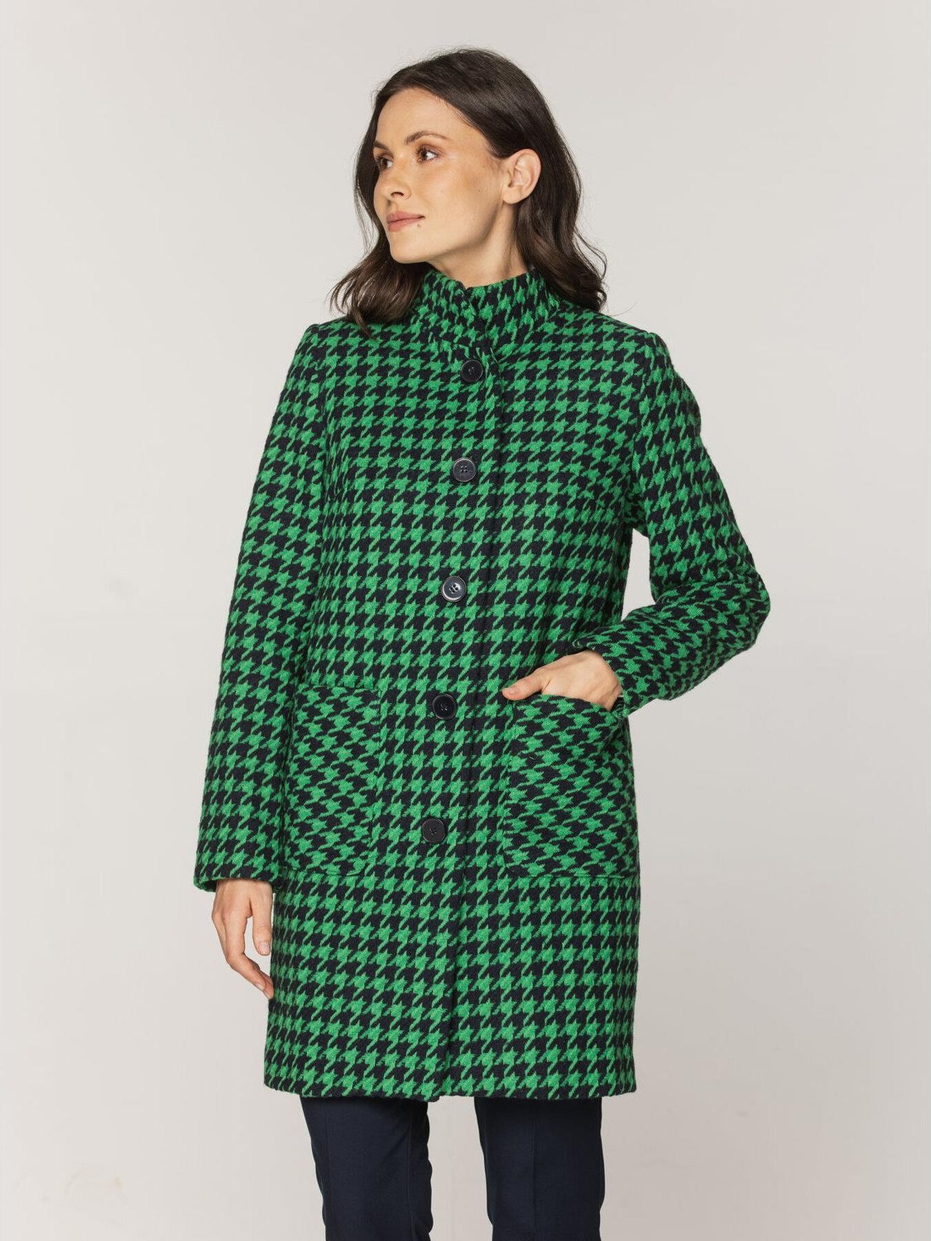 Jednorzędowy płaszcz w zieloną i czarną pepitkę, o luźniejszym fasonie ze stójką, zapinany na duże, czarne guziki