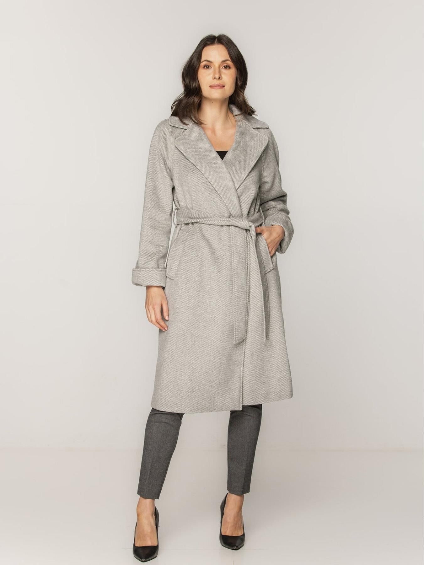 Luźny, długi płaszcz damski w szarą jodełkę; tkanina z wełną