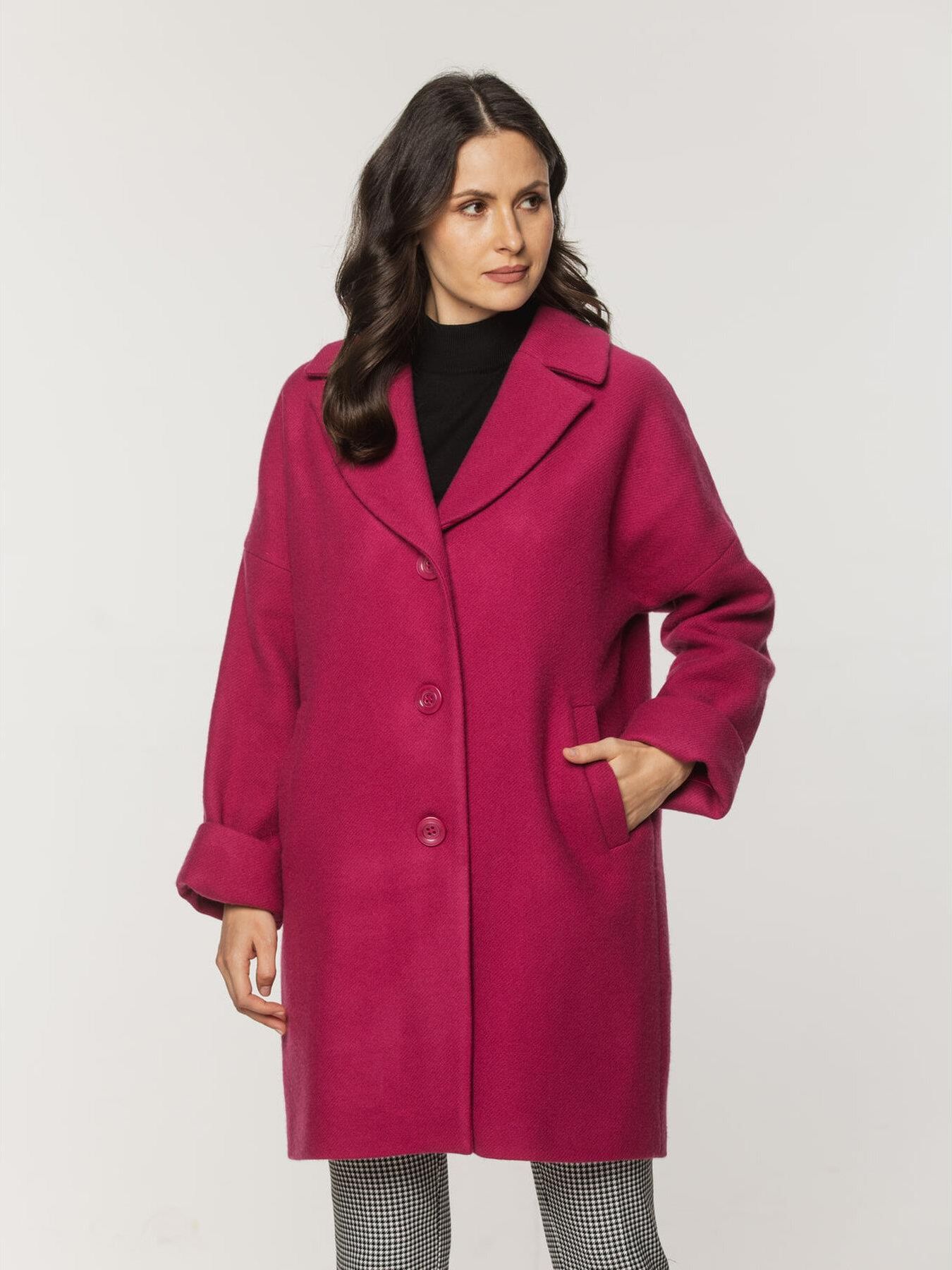 Fuksjowy, jednorzędowy płaszcz o gładkiej fakturze, o luźniejszym fasonie ze stójką, zapinany na duże, różowe guziki; tkanina z przewagą wełny