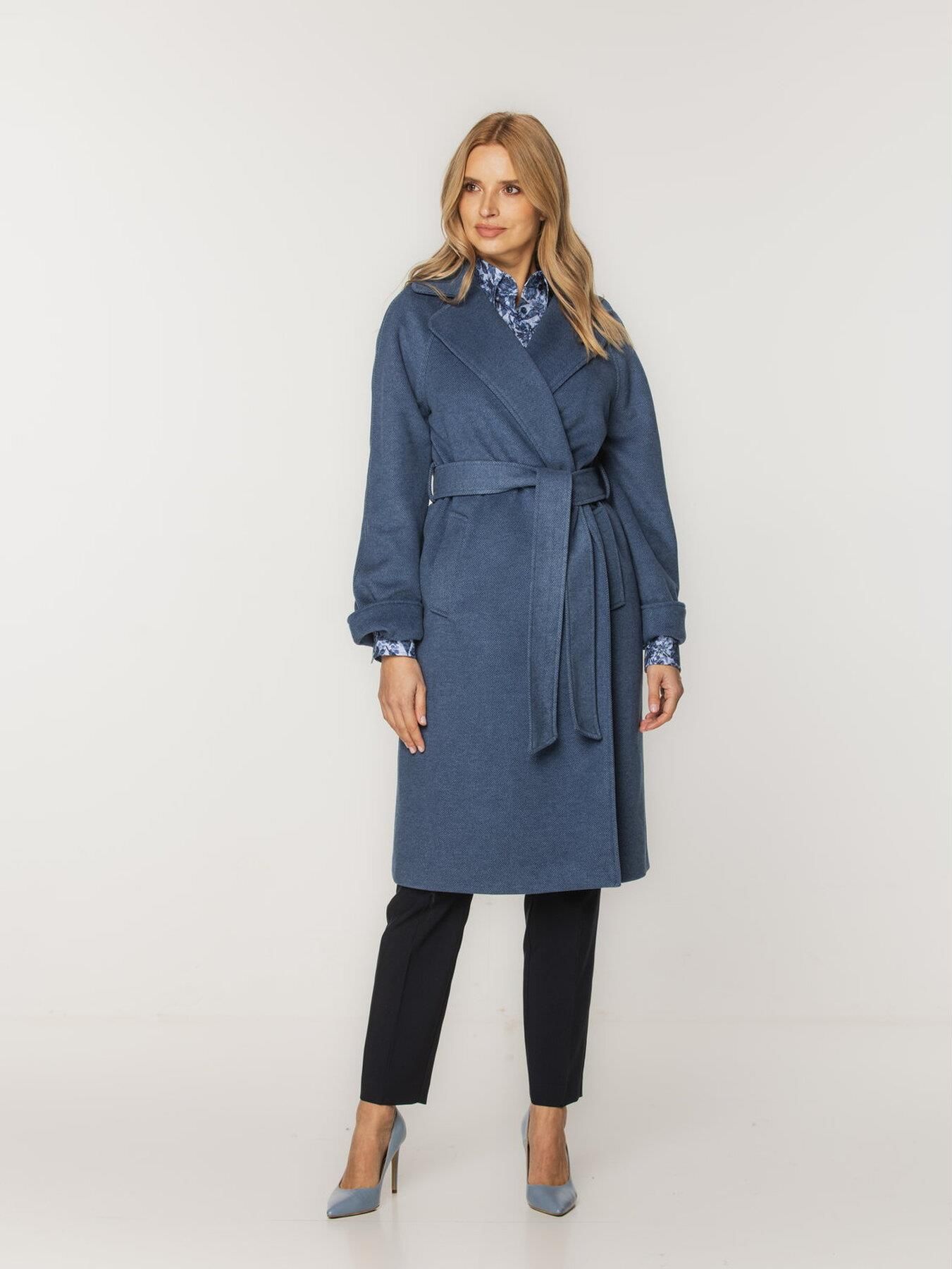 Luźny, długi płaszcz damski w niebieskim kolorze i fakturze w delikatny, drobny przeplot