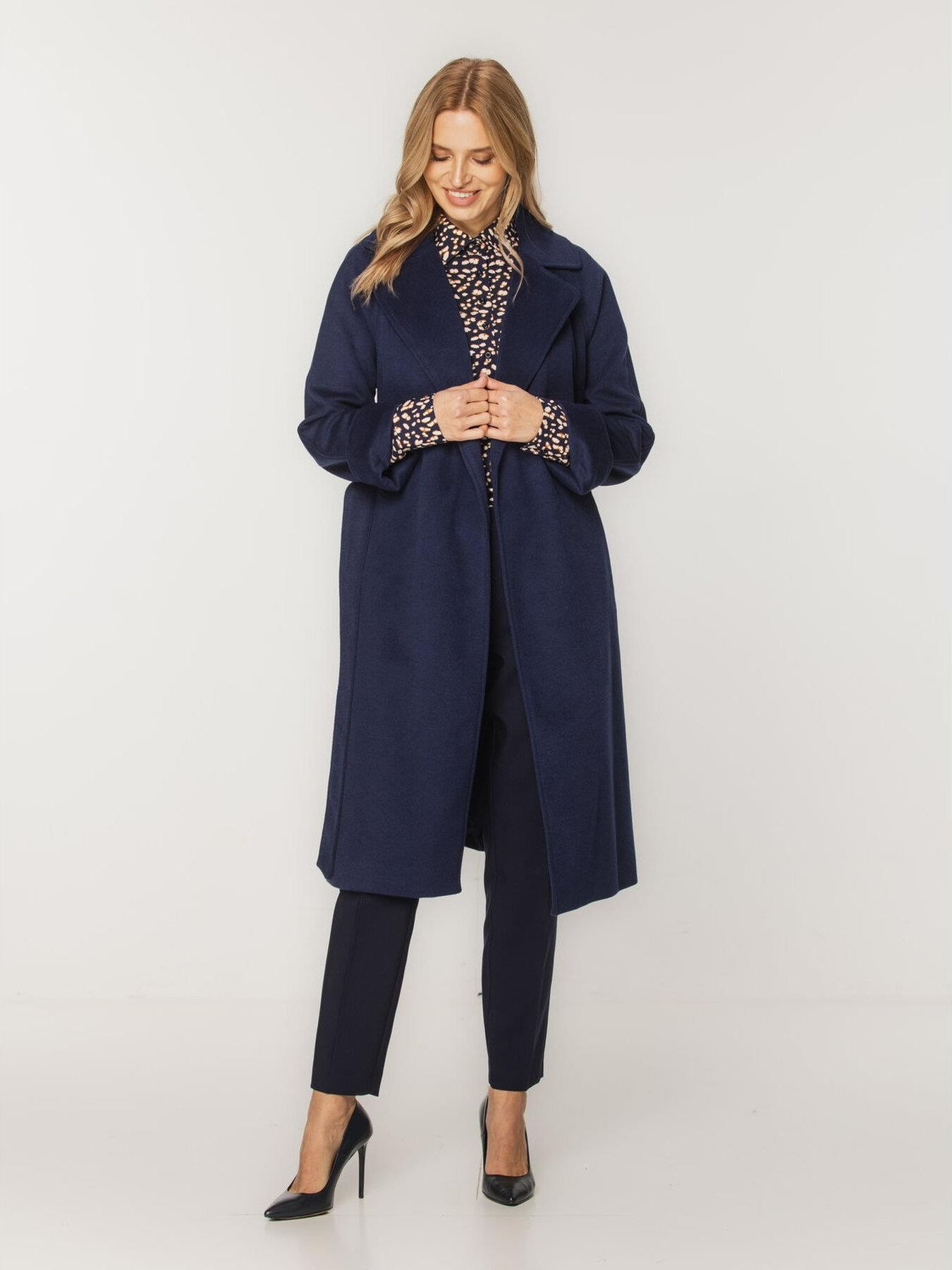 Luźny, długi płaszcz damski w granatowym kolorze i fakturze w delikatny, drobny przeplot