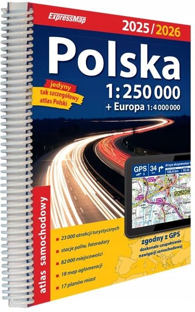 Polska Atlas samochodowy 1:250 000 seria: atlasy samochodowe data wydania: 2025/2026 data aktualizacji: 2025 format: 20 x 29 cm liczba stron: 336 oprawa: miękka za skrzydełkami wersja językowa: polska ISBN: 978-83-8355-593-5 EAN: 9788383555935 Publikacja nagrodzona! Z atlasem samochodowym Polski wydawnictwa ExpressMap podróż po kraju będzie prawdziwą przyjemnością. To jedyna tak szczegółowa tego typu publikacja na rynku. Uwzględnia 82 tys. miejscowości i 365 tys. km dróg. Publikacja jest użyteczna zarówno dla zawodowych kierowców, jak i turystów podróżujących samochodem – zaznaczono w niej także atrakcje turystyczne. Atlas zawiera: • stan sieci drogowej 2025, a także drogi w budowie i planowane,• autostrady i drogi ekspresowe z nazwami węzłów,• krajową i międzynarodową numerację dróg,• odległości drogowe,• stacje paliw z podziałem na sieci,• stacje ładowania pojazdów elektrycznych przy autostradach i drogach ekspresowych,• fotoradary stałe, odcinkowe pomiary prędkości,• wybrane motele i hotele,• granice parków narodowych i krajobrazowych,• miejscowości atrakcyjne turystycznie,• 23 tys. atrakcji turystycznych,• plastyczną rzeźbę terenu,• skorowidz ponad 71 tys. miejscowości z terenu Polski wraz z informacją o województwie i powiecie, dodatkowo dostępny do pobrania w formacie PDF,• 18 tranzytowych map miast,• 17 planów miast,• atlas Europy 1:4 000 000,• mapę dróg objętych systemem e-TOLL i płatnych autostrad,• przeglądową mapę głównych dróg Polski,• mapę tablic rejestracyjnych,• formularz wspólnego oświadczenia o zdarzeniu drogowym.