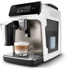 Dostępne napoje:Cappuccino, czarna, Espresso, gorąca woda;Cichy młynek:tak;Ciśnienie:15 barów;Części nadające się do mycia w zmywarce:kratka ociekowa, pojemnik na fusy, pojemnik na mleko, taca ociekowa;Długość przewodu zasilającego:1 m;Dominujący odcień:biały;Dwa pojemniki na kawę:nie;Ekspres do biura:nie;Relacje:Philips EP2x;Pasujący filtr:Aqua Clean;Filtr w wyposażeniu:tak;Funkcja Moja kawa:tak;Funkcje dodatkowe:cappuccino za jednym dotknięciem (one touch), funkcja oszczędzania energii, możliwość parzenia herbaty, ziół;Gwarancja:24 miesiące;Higiena i czyszczenie ekspresu:przypomnienie o wymianie filtra, sygnalizowanie konieczności odkamienienia, ustawienie twardości wody, wyjmowany blok zaparzający;Czyszczenie ekspresu:filtr wody, sygnalizowanie konieczności odkamienienia, wyjmowany blok zaparzający;Inne:parzenie wstępne;Interoperacyjność 3.1 - link do strony aplikacji:0;Interoperacyjność 3.2 - link do strony aplikacji:0;Interoperacyjność 5 - tekst 1:0;Interoperacyjność 9 - link do strony produktu u producenta:0;Kolor:biało-srebrny;Liczba napojów:4;Liczba profili użytkowników:1;Maksymalna wysokość naczynia:14,5 cm;Menu w języku polskim:tak;Młynek:ceramiczny;Moc:1500 W;Możliwość przygotowania zimnych napojów:nie;Parzenie dwóch kaw jednocześnie:tak;Parzenie dwóch kaw mlecznych jednocześnie:nie;Pojemność zbiornika na kawę:275 g;Pojemność zbiornika na wodę:1,8 l;Regulacja ilości zaparzanej kawy:tak;Regulacja mocy kawy:tak;Regulacja stopnia zmielenia kawy:tak;Regulacja temperatury kawy:tak;Regulacja wysokości dyszy:tak;Regulacja wysokości podstawki pod filiżankę:nie;Rodzaj kawy:ziarnista, mielona;Seria:LatteGo;Seria:Philips LatteGo;Sterowanie:ekran dotykowy;Sterowanie smartfonem:nie;System grzewczy:Thermoblock;System spieniający mleko:wbudowany pojemnik na mleko;Typ ekspresu:automatyczny;Wskaźnik poziomu wody:tak;Wyjmowany pojemnik na kawę:nie;Wyjmowany pojemnik na mleko:tak;Wyjmowany pojemnik na wodę:tak;Głębokość:433 mm;Szerokość:246 mm;Wysokość:371 mm;Wyposażenie:pojemnik na mleko, miarka do kawy mielonej, pasek testowy do badania twardości wody, instrukcja obsługi w języku polskim, karta gwarancyjna, smar do bloku zaparzającego, pojemnik na wodę, filtr wodny AquaClean, kabel zasilający;Wyświetlacz:kolorowy wyświetlacz;Zastosowane technologie:pojemnik na ziarna Philips AromaSeal, spienianie mleka Philips LatteGo
