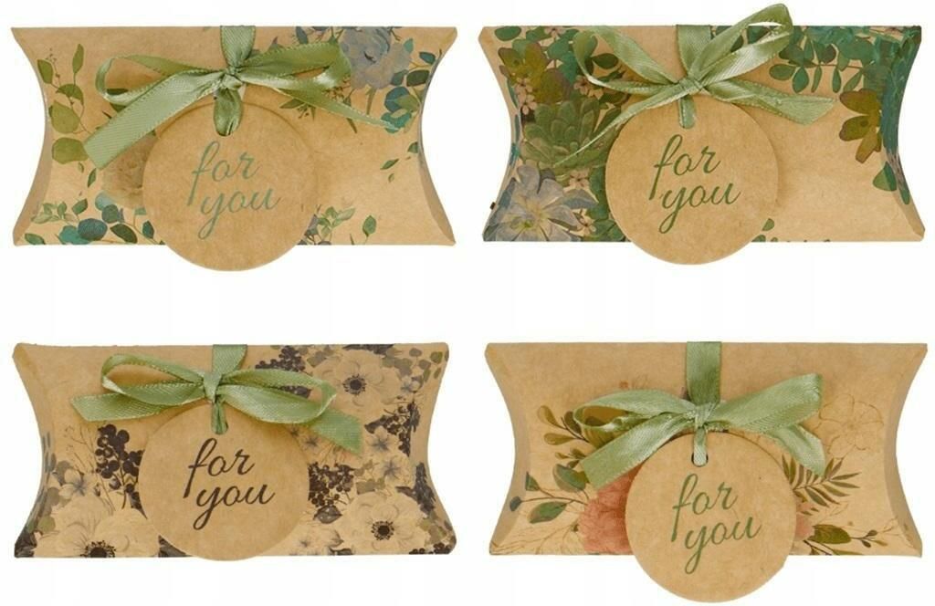 Zestaw 8 pudełek składanych na drobny upominek: urocze pudełeczka przewiązane tasiemką z zawieszonym tagiem, eleganckie wzory odpowiednie na różne okazje, wykonane z eleganckiego papieru craft, doskonałe do zapakowania drobnych prezentów takich jak np. biżuteria, świetnie sprawdzą się jako pudełeczka na prezent w podziękowaniu dla gości po wszelkiego rodzaju okolicznościach jak śluby, wesela, chrzciny itp., wymiar pudełka: 15 x 7 cm, w zestawie 8 pudełek - po 2 szt. z 4 wzorów. Kraj produkcji: Polska