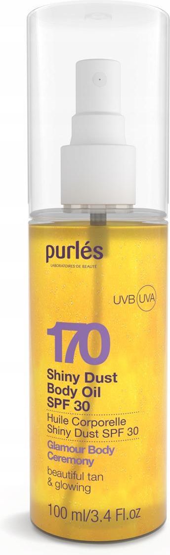 Suchy olejek do ciała z połyskującymi drobinkami i filtrem SPF 30. Precyzyjnie skomponowana formuła łączy w sobie działanie odżywcze, widoczne rozświetlenie i właściwości ochronne. Wśród dobroczynnych składników produktu znajduje się ekstrakt z łupin orzecha włoskiego – silny antyoksydant przywracający skórze jej naturalną elastyczność. Ekstrakt i olej z nasion marchwi stanowią źródło witamin i minerałów, wśród których szczególnie warto wyróżnić beta-karoten. Nadaje on skórze ciepłe tony, wyrównuje koloryt i poprawia wygląd opalenizny. Złote drobinki nadają skórze pięknego połysku. Olejek zapewnia niezbędną ochronę przed szkodliwym wpływem promieniowania UVA, jak i UVB. Chroni nie tylko przed poparzeniem skóry, ale również przed jej przedwczesnym starzeniem. Produkt otula cudownym zapachem, a bogactwo składników aktywnych zamknięte w każdej kropli tego eliksiru sprawia, że skóra emanuje zdrowym blaskiem. Purles 170 Shiny Dust Body Oil SPF 30 Rozświetlający Olejek do Ciała SPF 30 100ml Suchy olejek do ciała z połyskującymi drobinkami i filtrem SPF 30. Precyzyjnie skomponowana formuła łączy w sobie działanie odżywcze, widoczne rozświetlenie i właściwości ochronne. Wśród dobroczynnych składników produktu znajduje się ekstrakt z łupin orzecha włoskiego – silny antyoksydant przywracający skórze jej naturalną elastyczność. Ekstrakt i olej z nasion marchwi stanowią źródło witamin i minerałów, wśród których szczególnie warto wyróżnić beta-karoten. Nadaje on skórze ciepłe tony, wyrównuje koloryt i poprawia wygląd opalenizny. Złote drobinki nadają skórze pięknego połysku. Olejek zapewnia niezbędną ochronę przed szkodliwym wpływem promieniowania UVA, jak i UVB. Chroni nie tylko przed poparzeniem skóry, ale również przed jej przedwczesnym starzeniem. Produkt otula cudownym zapachem, a bogactwo składników aktywnych zamknięte w każdej kropli tego eliksiru sprawia, że skóra emanuje zdrowym blaskiem.Wskazania: – ochrona przed UV połączona z pielęgnacją skóry ciała– skóra sucha, matowa, o nieładnym kolorycie– chęć uzyskania ładnej opaleniznyDziałanie:– chroni przed promieniowaniem UVB oraz UVA– chroni przed fotostarzeniem– wyrównuje koloryt skóry– nadaje skórze zdrowy blask– poprawia wygląd opaleniznyRezultaty:– 95% osób badanych potwierdziło, że po zastosowaniu produktu skóra jest rozświetlona i pełna zdrowego blasku.– 90% osób badanych potwierdziło, że produkt bezproblemowo rozprowadza się na skórze i nie pozostawia lepkiego filmu na skórze.**badanie wykonano na grupie 20 osób Składniki aktywne: Ekstrakt z łupin orzecha włoskiego – wykorzystywany jako surowiec zielarski i leczniczy. Ma silne właściwości ściągające, antybakteryjne i antyseptyczne. Dzięki swoim właściwościom koloryzującym łupiny wykorzystuje się jako naturalny barwnik do farbowania włosów i tkanin. Nadaje lekko brązowy odcień skórze.Ekstrakt z korzenia marchwi – źródło witamin i minerałów m.in. beta-karotenu, który ma silne działanie antyoksydacyjne, a jako prekursor witaminy A warunkuje szybką odnowę zrogowaciałego naskórka, skutecznie poprawiając wygląd skóry. Kosmetyki z wyciągiem z marchwi wyrównują koloryt, nadają skórze ciepły odcień, pomagają uzyskać ładną i trwałą opaleniznę.Olej z nasion marchwi – zawiera ok. 79% kwasu oleinowego, który nadaje olejowi mocno regenerujące właściwości. W skład nasion wchodzi m.in. beta-karoten, witaminy z grupy B, C, E i A, minerały i kwasy tłuszczowe. Wspomaga ochronę skóry przed wolnymi rodnikami, poprawia poziom nawilżenia, wzmacnia barierę naskórkową.Witamina E – bardzo skuteczny antyoksydant. Chroni przed stresem oksydacyjnym wszystkie składniki tłuszczowe skóry. Zapobiega fotostarzeniu, działa przeciwzapalnie i wzmacnia barierę hydrolipidową naskórka, dzięki czemu skóra staje się lepiej nawilżona i bardziej elastyczna.Przyjazny zwierzętom, nie zawiera parabenów, nie zawiera SLS/SLES, nie zawiera olei mineralnych, nie zawiera silikonów, nie zawiera substancji z grupy PEG, wegański, bez modyfikacji genetycznych, nie zawiera trietanoloaminy, nie zawiera glutenu.