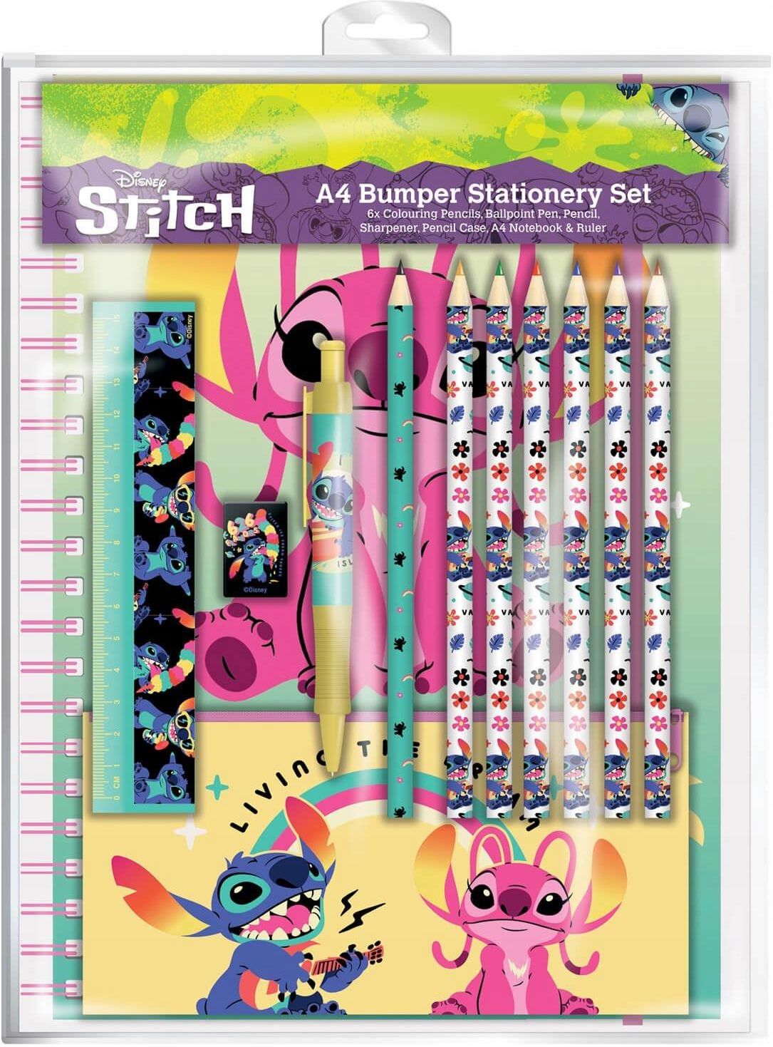 DISNEY LILO STITCH (ACID POPS) BUMPER STATIONERY SET / Disney Lilo i Stitch zestaw piśmienniczy Wprowadź odrobinę kosmicznej radości do szkolnej wyprawki z wyjątkowym zestawem piśmienniczym Lilo i Stitch! Zainspirowany przygodami dwójki uwielbianych bohaterów, zestaw zawiera wszystko, czego potrzeba do twórczej nauki i zabawy: długopis z czarnym tuszem, ołówek, kredki, linijkę, notes A5 (25 kartek w grubą linię), piórnik, temperówkę oraz gumkę do ścierania. Kolorowy i praktyczny – to świetny prezent dla każdego małego fana Disneya! Oficjalnie licencjonowany produkt. Seria filmów Lilo i Stitch to wzruszająca historia o przyjaźni, akceptacji i rodzinie, która pokazuje, że nawet najbardziej niesforne stworzenia zasługują na miłość. Stitch, choć stworzony jako kosmiczny psotnik, zdobywa serca dzięki lojalności i uroczemu charakterowi. Razem z Lilo przeżywa mnóstwo przygód, które bawią i uczą całe pokolenia. Zestaw dedykowany jest dzieciom powyżej 3. roku życia. Z Stitch’em nawet lekcje są przygodą! Niech szkoła stanie się bardziej magiczna – z pomocą kosmicznego przyjaciela!