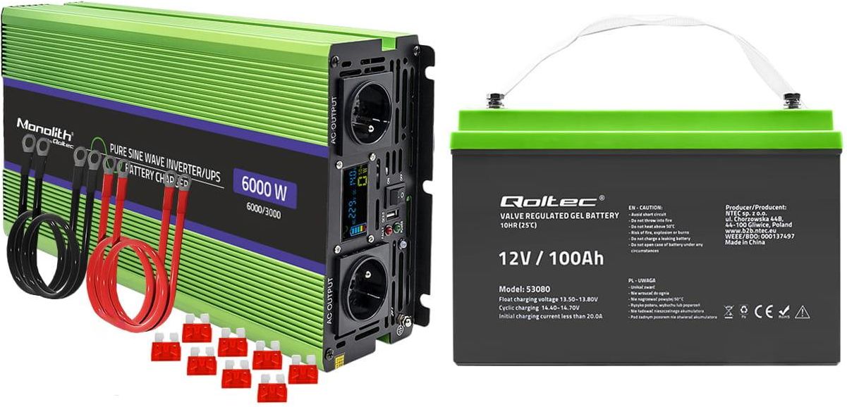 Specyfikacja: Producent: Qoltec Moc znamionowa: 3000W Moc całkowita (chwilowa): 6000W (5 sekund) Napięcie wejściowe: 12V Napięcie wyjściowe: 230V ± 5% Przebieg napięcia na wyjściu: Czysta fala sinusoidalna Częstotliwość wyjściowa: 50Hz ± 0.5% Zniekształcenia fali: THD poniżej 3% Prąd jałowy: powyżej 1.3A Ładowanie stałym napięciem: 14.6VDC Zakres napięcia wejściowego: 190 ῀260VAC Ładowanie stałym prądem: 15A Ładowanie buforowe: 13.8VDC Prąd wejściowy: 15A Prąd wyjściowy: 15A Sprawność: 90% Chłodzenie: Inteligentne chłodzenie Porty USB: 5V/1A Zabezpieczenie przed odwrotną polaryzacją Zabezpieczenia: LVP/OVP/OCP/OTP/SCP Temperatura pracy: -10˚C ~ +50˚C Temperatura przechowywania: -30˚C ~ +70˚C Materiał: Aluminium Wymiary: 210 x 515 x 90 mm Waga: 8.20 kg Certyfikat: CE Gwarancja: 24 miesiące Kod produktu: 26376 Kod zestawu: 26518 Przetwornica marki Qoltec to połączenie funkcji: Przetwornicy napięcia 12 V na 230 V, po podłączeniu akumulatora przetwornica pobiera potrzebną energię do zasilenia podłączonego urządzenia. Ładowarki akumulatorów, po podłączeniu do sieci, urządzenie automatycznie przechodzi w tryb ładowania akumulatora. Zasilacza UPS, w momencie wykrycia zaniku zasilania z sieci urządzenie przechodzi w tryb zasilania awaryjnego, korzystając z energii zgromadzonej w akumulatorze do momentu pojawienia się napięcia w sieci. Przetwornica może jednocześnie ładować akumulator i zasilać podłączone urządzenia. Przetwornica napięcia czyli mobilna energia w czystym wydaniu Przetwornica marki Qoltec to czysty sinus, wytwarza prąd taki sam jak w gniazdku 230V, zapewniając bezpieczeństwo dla wszystkich podłączonych urządzeń. Świetnie sprawdzi się zarówno podczas przerw w dostawach prądu, jak i podczas podróży, gdy nie mamy dostępu do gniazdka. Wybierając odpowiednią przetwornicę warto zwrócić uwagę na wartość mocy i napięcie akumulatora, które musi być zgodne z podanym na przetwornicy by zapewnić naszym sprzętom odpowiednie warunki do pracy. Istotna jest również ilość podłączonych urządzeń np. podłączając laptop i drukarkę, moc obu urządzeń należy zsumować. Pamiętajmy, że pobierana moc jaką potrzebuje podłączone urządzenie nie powinna przekraczać wartości 85% mocy znamionowej przetwornicy. Nie trać energii w podróży Produkt idealnie sprawdzi się jako źródło energii w kamperach czy przyczepach podczas wyjazdów rodzinnych. Planujesz dłuższe wakacje na polu namiotowym lub nad jeziorem i szukasz sposobu by podłączyć laptopa lub podładować telefon na jachcie ? Warto się dobrze przygotować. Dzięki przetwornicy marki Qoltec będziesz mógł zasilić swoje urządzenia w każdym miejscu i cieszyć się wygodą i komfortem. Przetwornica napięcia będzie idealnym źródłem energii dla posiadaczy jachtów i łodzi. To inteligentne urządzenie pozwoli Ci na zasilanie sprzętu podczas długich wypraw poza domem, posiada port USB oraz gniazda sieciowe, do których można podpiąć urządzenia elektryczne. Bez żadnych przeszkód możesz naładować telefon, laptopa lub podłączyć inne urządzenie, którego moc nie przekracza mocy przetwornicy, co więcej jednocześnie możesz ładować akumulator. W zależności od mocy pobieranej przez urządzenie przetwornica 3000W może zasilić takie urządzenia jak : Sprzęt RTV: TV, konsola do gier, sprzęt muzyczny, radio. Sprzęt Gospodarstwa Domowego: lodówka, mikrofalówka, zamrażarka, ekspres do kawy, toster, opiekacz. Sprzęt biurowy: komputery, drukarki, laptopy. Inne: elektronarzędzia np. wiertarka, suszarka, ładowanie łodzi, klimatyzacja. Przetwornica może być również używana nie tylko w podróży, ale również jako awaryjne źródło energii np. podtrzymanie pieca CO lub do zasilania sprzętów jako zasilacz UPS podczas chwilowego braku zasilania z sieci energetycznej. Wytrzymała i lekka obudowa Obudowa zaprojektowana została z wysokiej jakości aluminium odpornej na wstrząsy i uszkodzenia mechaniczne. To idealny wybór dla osób lubiących długie podróże. Dzięki przetwornicy z wbudowanym gniazdem sieciowym możesz korzystać z prawie każdego urządzenia wymagającego podłączenia do gniazdka. Wyposażony w wyświetlacz LCD, który monitoruje wszystkie najważniejsze parametry urządzenia. Produkt posiada port USB do ładowania urządzeń mobilnych i automatyczny wentylator dbający o odpowiednie chłodzenie. Zdalny przełącznik zasilania o długości 260 cm Włączanie przetwornicy za pomocą dodatkowego kabla z włącznikiem może być praktycznym rozwiązaniem w wielu sytuacjach. Kabel pozwoli na zarządzanie zasilaniem przetwornicy, co może być przydatne w przypadku potrzeby szybkiego wyłączenia lub włączenia urządzenia. Dzięki włącznikowi można szybko ją wyłączyć, gdy nie jest potrzebna, co może pomóc w oszczędzaniu energii lub może być szybkim sposobem na zatrzymanie dostarczania energii w przypadku awarii. Pełne zaufanie do jakości zasilania twoich urządzeń Produkt wyposażony w szereg zabezpieczeń, które gwarantują pełną ochronę dla podłączonych urządzeń. Dodatkowo zestaw zawiera zapasowe bezpieczniki by zapewnić jak najdłuższe działanie sprzętu. Przetwornica posiada: Zabezpieczenie UVP - chroni urządzenia przed zbyt niskim napięciem na wyjściu, które ma wpływ na stabilność podłączonych urządzeń, Zabezpieczenie SCP - to zabezpieczenie przeciwzwarciowe, Zabezpieczenie OVP - to ochrona przed zbyt wysokim napięciem wyjściowym i uszkodzeniem podłączonych urządzeń, Zabezpieczenie OCP - to zabezpieczenie przed zbyt wysokim prądem na linii, Zabezpieczenie OTP - to zabezpieczenie przed przegrzaniem. Akumulator żelowy firmy Qoltec GEL Professional LongLife 12V 100Ah Producent: Qoltec Typ akumulatora: VRLA Technologia: GEL Pojemność: 100Ah Napięcie: 12V Rezystancja wewnętrzna: 5.3mΩ Maksymalny prąd ładowania: 30A Polaryzacja: L+ Ład