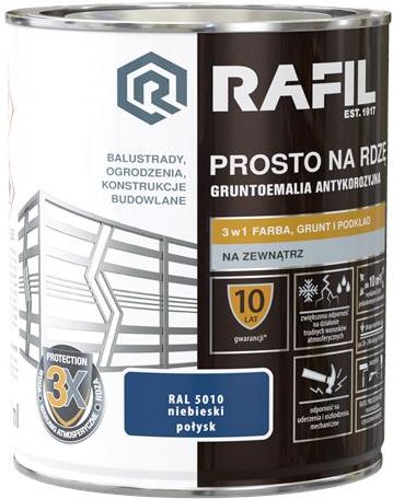 RAFIL Prosto na Rdzę Połysk Pojemność: 0,75L | Kolor: RAL5010 niebieski ZASTOSOWANIE Metal Barierki i balustrady Wyroby kowalstwa artystycznego Bramy i ogrodzenia Elementy ozdobne DOSTĘPNE KOLORY RAFIL PROSTO NA RDZĘ POŁYSK złoty srebrny RAL3011 wiśniowy RAL5010 niebieski RAL6005 …