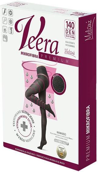 Rajstopy 140 den, kolor melanż I klasa ucisku 18-21 mmHg Eleganckie rajstopy ze stopniowanym uciskiem, testowanym klinicznie. Każdego dnia dbają o zdrowie i jednocześnie o piękno Twoich nóg. Wyglądają jak klasyczne rajstopy, a znacznie się różnią właściwościami: przynoszą ulgę zmęczonym nogom poprawiają krążenie krwi zapobiegają pierwszym zmianom żylakowym zapobiegają pojawianiu się pajączków sprawiają, że po całym dniu Twoje nogi są nadal lekkie Veera zapobiega zastojom krwi żylnej, obrzękom oraz pękaniu drobnych naczynek (pajączków). Chroń swoje nogi. Niech będą zdrowe i piękne przez długie lata. Produkty Veera to linia produktów najwyższej jakości. Są przetestowane klinicznie, co zapewnia ich skuteczność. Prawie każda kobieta codziennie nosi rajstopy, podkolanówki, pończochy - Veera jest stworzona dla kobiet, które dbają o swoje nogi, bądź jedną z nich - Stosuj profilaktykę! Dzięki włóknom Lycry oraz wzmocnionej pięcie i palcach, rajstopy są trwałe i zapewniają prawidłowe ułożenie wyrobu na nodze oraz właściwe rozmieszczenie ucisku. Skład: 78% Poliamid 22% Elastan Dostępne wymiary Rozmiar Rozmiar stopy [cm] 134 - 36236 - 38338 - 40440 - 41541 - 42 Jak mogę wybrać rozmiar? Przy składaniu zamówienia w polu "uwagi do zamówienia" wpisz odpowiedni rozmiar np. MPrzy wyborze większej ilości sztuk w różnych rozmiarach wpisz" ​​np. S - 2 szt, L - 5 szt ​