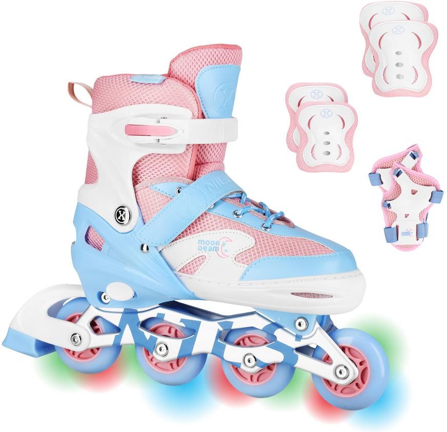 Rolki Regulowane Rekreacyjne Kauczukowe Kółka LED + Zestaw Ochraniaczy NILS Najważniejsze cechy Kompletny zestaw: rolki + ochraniacze Koła PU z efektownym oświetleniem LED Łożyska ABEC-7 – płynna i cicha jazda Trzystopniowe zapięcie: klamra, sznurówki, rzep Ochraniacze klasy A: kolana, łokcie, …