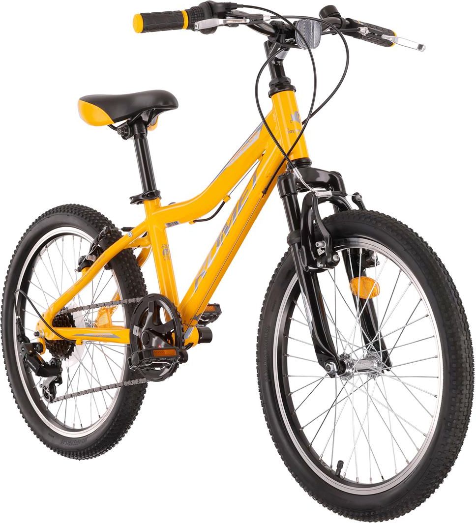 Rower dziecięcy Romet Rambler KID 2 20 (10") żółty/szary SPECYFIKACJA KOŁA, RAMA 20 / aluminiowa 6061 WIDELEC Amortyzowany AMORTYZATOR TYŁ — NAPĘD 1x6 MANETKI PRZÓD — MANETKI TYŁ Shimano Revoshift SL-RV400 6 biegów PRZERZUTKA PRZÓD — PRZERZUTKA TYŁ Shimano Tourney RD-FT35 MECHANIZM KORBOWY Cyclone …