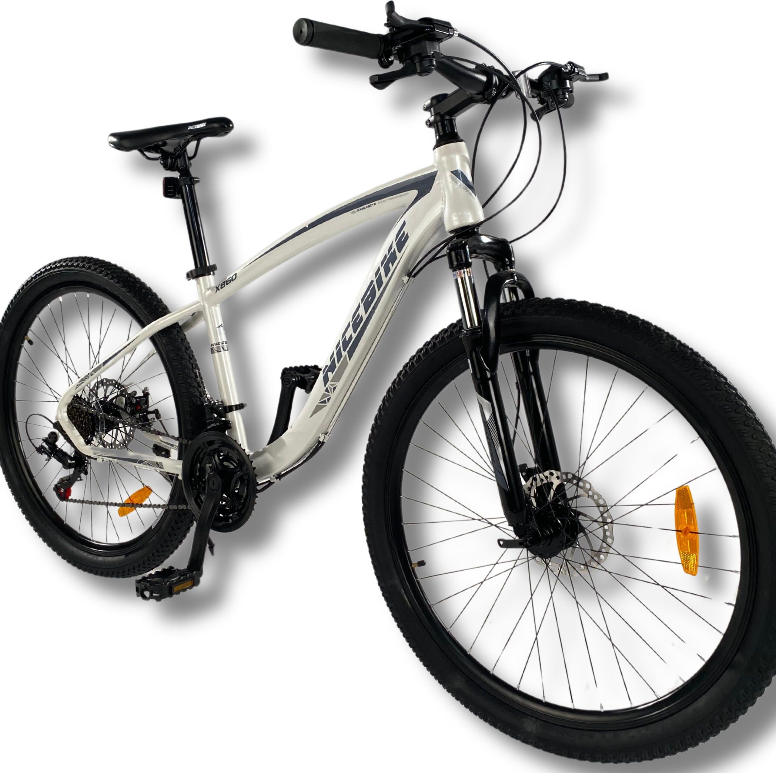 ROWER GÓRSKI NICEBIKE X860 MTB 26 SHIMANO 21 BIEGÓW SHIMANO 2xTARCZE RAMA 16" KOŁA 26" Specyfikacja Rama: 16" stalowa cieniowana Rozmiar kół: 26" Opony: 26" x 2,125 szosowo - terenowe Szeroka wygodna kierownica - szerokość kierownicy 74 cm Manetki: Klamko-manetki Shimano St-Ef Widelec: Amortyzowany Klamki Hamulca: Aluminiowe Power Grip Piasty: Stalowe Obręcze: Aluminiowo stożkowe dwukomorowe Siodło: Profilowane V-Cut Łańcuch: Wyposażony w prowadnicę Wolnobieg: SHIMANO TZ20 Tylna przerzutka: Shimano Tourney TZ Przednia przerzutka: 3 Biegi Shimano Tourney TZ Ilość biegów: 21 Hamulce: Tarczowe Mechaniczne Pedały: Szerokie platformowe Przednie koło na szybkozamykacz Waga: 14 kg Max obciążenie: 120 kg Dla wzrostu: 145 cm - 169 cm JAKO PRODUCENT przykładamy wielką wagę do jakości naszych rowerów. Rowery są wykonane z NAJWYŻSZEJ JAKOŚCI KOMPONENTÓW. Przy tym zachowujemy bardzo konkurencyjną cenę produktu. ROWER WYPPOSAŻONY W OSPRZĘT SHIMANO wolnobieg, przerzutki przednie i tylne oraz klamkomanetki NAPĘD ROWER X860 jest wyposażony w 3-biegową przednią przerzutkę Shimano TZ30 i 7-biegowątylną przerzutkę Shimano TZ50. Zmiana biegów jest kontrolowana przez manetki Shimano ST-EF 500. Zmiana biegów jest płynna i szybka. AMORTYZATOR PRZEDNIEGO WIDELCA WIDELEC - X860 posiada amortyzowany widelec. Ma on na celu zwiększenie komfortu jazdy w nierównym terenie. HAMULCE TARCZOWE X860 jest wyposażony w parę potężnych i responsywnych mechanicznych hamulców tarczowych, które są przymocowane do dźwigni hamulca Shimano EF500. Te dźwignie hamulcowe są łatwe do włączenia i pozwalają całkowicie zatrzymać rower zarówno w mokrych, jak i suchych warunkach. RAMA ZE STALI CIENIOWANEJ X860 jest wyposażony w sportową ramę Performance Geometry. Ta rama ma sportową geometrię, która zapewni Ci optymalne osiągi podczas jazdy w terenie. Rama jest lekka i nie przenosi wibracji na rowerzystę podczas jazdy w terenie. SIODEŁKO ROWER X860 jest wyposażony w wygodne siodło , które jest również ergonomiczne. Dzięki temu siodełku możesz spędzać długie godziny na szlaku i nie odczuwać bólu. Dodatkowo opcja szybkiego zwalniania na sztycy ułatwia regulację wysokości siodełka podczas jazdy. WYMIARY Rower przeznaczony jest dla wzrostu: 145 cm - 169 cm Wszystkie szczegółowe wymiary znajdziesz na poniższym zdjęciu Rower jest wstępnie złożony, wystarczy jedynie przykręcić kierownicę, pedały, założyć przednie koło i siodło. Rower trzeba wyregulować