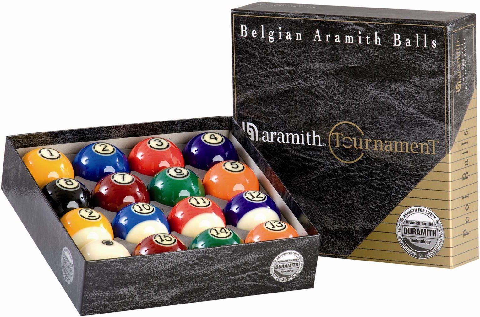 Bile pool 57,2mm ARAMITH TOURNAMENT. Komplet numerowanych bil do gry w pool bilarda o średnicy 57,2mm. ARAMITH TOURNAMENT. Bile wyprodukowane są przez belgijską firmę SALUC, która oferuje najlepsze na świecie kule bilardowe pod nazwą ARAMITH. Bile ARAMITH TOURNAMENT wykonane są przy użyciu najnowszej technologii DURAMITH. Charakterystyka: 15 bil numerowanych 16 kul bilardowych od 1 do 15 o średnicy 57,2mm, wykonanych z termoutwardzalnej żywicy w technologii DURAMITH 1 bila biała o średnicy 57,2mm bile te charakteryzują sie wysoką wytrzymałością na zarysowania i mocne uderzenia, a idealne wyważenie bil sprawia, iż gra jest czystą przyjemnością. minimalizują zużycie sukna