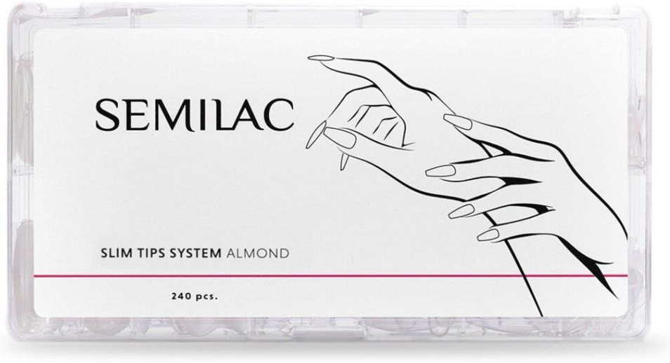 Semilac Slim Tips System Almond Tipsy Do Przedłużania Paznokci 240 szt. Semilac Slim Tips System Ballerina to wysokiej jakości cienkie tipsy, które pozwolą Tobie w szybki i łatwy sposób przedłużyć paznokcie, uzyskując kształt smukłego kwadratu. Idealnie sprawdzą się w przypadku osób rozpoczynających przygodę z przedłużaniem paznokci. Dzięki nim, Twoje paznokcie będą wyglądały elegancko i profesjonalnie, jakby były wykonane w salonie kosmetycznym. W opakowaniu znajdziesz 12 różnych rozmiarów, co pozwala na idealne dopasowanie tipsa do każdego paznokcia. Ilość sztuk w opakowaniu: 240. Cechy Produktu 💅 Wysoka jakość: Cienkie tipsy, które zapewniają profesjonalny wygląd paznokci. 📦 Duża ilość: 240 sztuk w opakowaniu, co pozwala na długotrwałe użytkowanie. 🧩 12 różnych rozmiarów: Idealne dopasowanie do każdego paznokcia. 🌟 Łatwość użycia: Idealne dla osób rozpoczynających przygodę z przedłużaniem paznokci. 🕒 Szybkie utwardzanie: Możliwość wstępnego utwardzenia przy pomocy Semilac lampki punktowej. Zastosowanie Produktu Semilac Slim Tips System Almond Tipsy są idealne do przedłużania paznokci w domowym zaciszu lub profesjonalnym salonie kosmetycznym. Dzięki nim, można uzyskać elegancki i smukły kształt paznokci, który jest modny i stylowy. Najważniejsze Składniki Produkt wykonany jest z wysokiej jakości materiału, który zapewnia trwałość i elastyczność tipsów, umożliwiając łatwe dopasowanie do naturalnej płytki paznokcia. Stosowanie 1. Przygotuj paznokcie. 2. Dopasuj tips do naturalnego paznokcia (powinien być szerokości płytki – zasłaniać go od boku do boku). 3. Na zmatowioną „kieszonkę” po wewnętrznej stronie nałóż kroplę bazy budującej – rekomendujemy Semilac Extend Base. 4. Przyłóż starannie do paznokcia zaczynając od skórek, bardzo delikatnie dociśnij w stronę wolnego brzegu. Forma powinna dobrze przylegać do paznokcia. 5. W celu zapewnienia właściwego mocowania wykonaj wstępne utwardzenie przy pomocy Semilac lampki punktowej. 6. Całość stylizacji utwardź w lampie. 7. Opracuj paznokieć zwracając uwagę również na jego wewnętrzną część. 8. Przed nałożeniem koloru rekomendujemy zmatowienie powierzchni tipsa. 9. Nałóż wybrany lakier lub wykończ stylizację topem. Dodatkowe Informacje Rekomendowane Produkty: Semilac Extend Base, Semilac lampka punktowa. Typ Tipsów: Smukły kwadrat. Idealne dla Początkujących: Produkt zaprojektowany z myślą o osobach zaczynających swoją przygodę z przedłużaniem paznokci. Specyfikacja Techniczna Produkt Semilac Slim Tips System Almond Tipsy Do Przedłużania Paznokci Ilość sztuk w opakowaniu 240 Rozmiary 12 różnych rozmiarów Typ Tipsów Smukły kwadrat Rekomendowane Produkty Semilac Extend Base, Semilac lampka punktowa