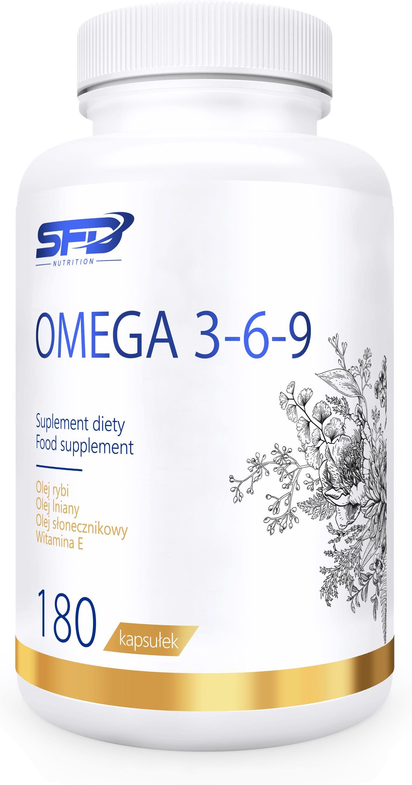SUPLEMENT DIETYOMEGA 3-6-9180 kapsułekKOMPLEKS CENNYCH KWASÓW TŁUSZCZOWYCH OMEGA 3-6-9WZBOGACONY WITAMINĄ E, KTÓRA POMAGA W OCHRONIE KOMÓREK PRZED STRESEM OKSYDACYJNYMAŻ 180 PORCJI W OPAKOWANIUWYGODNA FORMA KAPSUŁEK SFD Omega 3-6-9 to kompleksowy suplement diety, który dostarcza cennych kwasów tłuszczowych. Każda opakowanie zawiera 180 kapsułek, gwarantując długotrwałe wsparcie, aby maksymalnie wykorzystać korzyści płynące z kompleksu kwasów tłuszczowych.Co wyróżnia OMEGA 3-6-9?CENNE KWASY TŁUSZCZOWEOlej rybi jest bogaty w źródło kwasów tłuszczowych omega-3, w tym EPA i DHA, które przyczyniają się do prawidłowego funkcjonowania serca, a korzystne działanie występuje w przypadku spożywania 250 mg EPA i DHA dziennie [1].Olej lniany i olej słonecznikowy wspiera zdrowie, dzięki zawartości kwasów tłuszczowych omega-3 i omega-6.Dodatkowo, OMEGA 3-6-9 wzbogacona jest o witaminę E, która pomaga w ochronie komórek przed stresem oksydacyjnym [2].Odkryj niepowtarzalne wsparcie OMEGA 3-6-9!_________________________________________________________Składniki w porcji dziennej (1 pastylka)Olej rybi / 400 mgw tym EPA / 72 mgw tym DHA / 48 mgOlej lniany / 300 mgOlej słonecznikowy / 290 mgWitamina E / 10,5 mg (87,5%*)*RWS - referencyjna wartość spożycia _________________________________________________________Składniki: olej rybi, olej lniany, olej słonecznikowy, otoczka kapsułki (żelatyna, substancja utrzymująca wilgoć: glicerol), witamina e (octan dl-alfa tokoferylu)Zalecane porcjowanie: Stosować 1 kapsułkę dziennie (najlepiej podczas posiłku), popijając wodą. Nie przekraczać 1 porcji dziennie (1 kapsułka).Suplement diety. Produkt przeznaczony dla osób powyżej 18 roku życia. Nie spożywać w przypadku uczulenia na którykolwiek składnik produktu. Nie przekraczać zalecanej porcji do spożycia w ciągu dnia. Suplement diety nie może być stosowany jako substytut zróżnicowanej diety. Zalecany jest zbilansowany sposób żywienia i zdrowy tryb życia. Po użyciu opakowanie należy zawsze zamykać.Przechowywać w suchym miejscu, w temperaturze 15 °C – 25 °C, w sposób niedostępny dla małych dzieci. Chronić od światła. Producent: SFDOpakowanie: 180 kapsułek