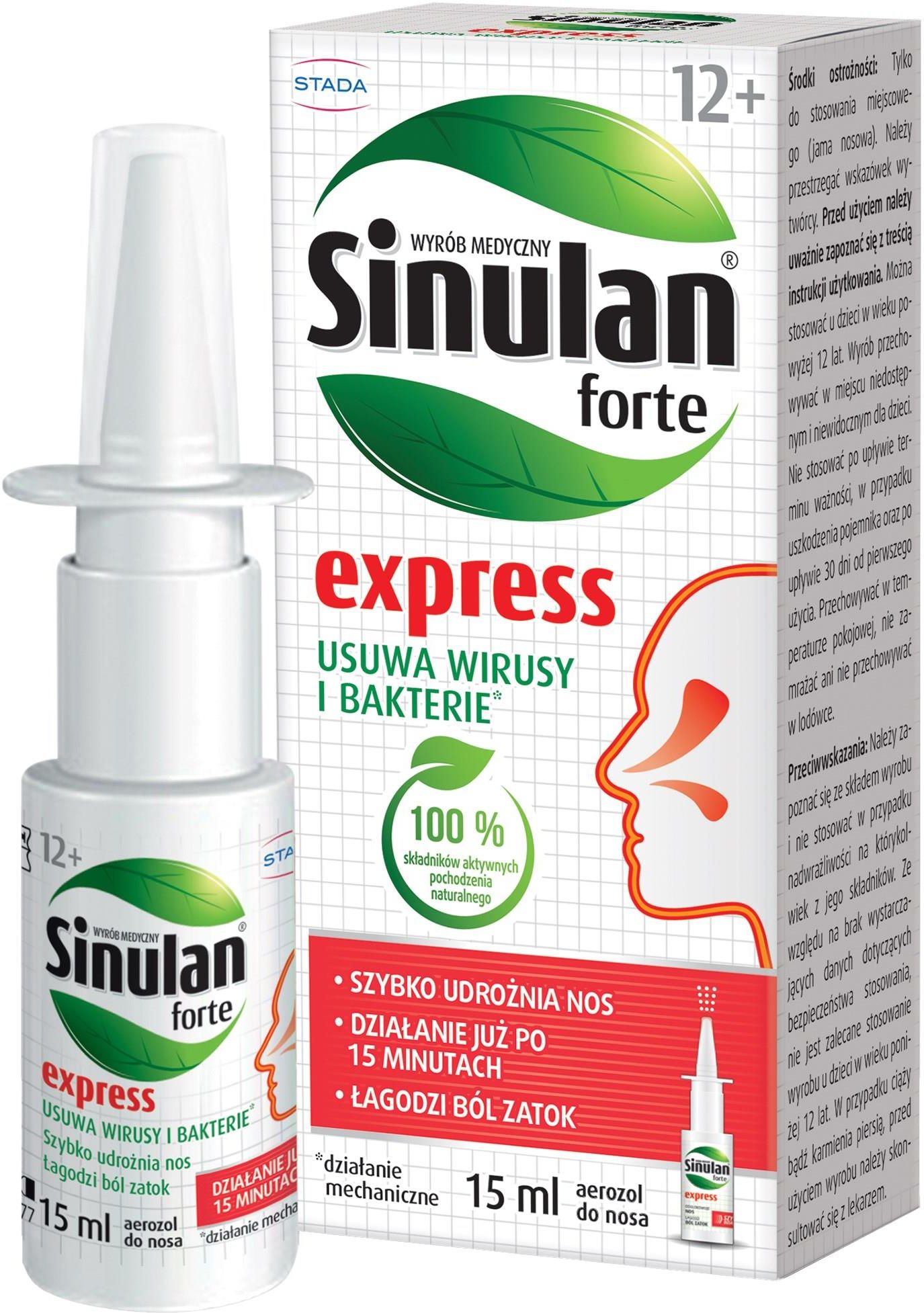 Sinulan Express Forte to wyrób medyczny w postaci aerozolu do nosa do zastosowania w leczeniu objawów zapalenia zatok przynosowych i nieżytu nosa różnego pochodzenia. Ma innowacyjny i opatentowany skład z unikalnym mechanizmem działania. Obkurcza naczynia błony śluzowej, dzięki czemu odtyka nos, działa przeciwbólowo, eliminuje bakterie i wirusy, a także chroni powierzchnię błony śluzowej nosa przed wysuszeniem, podrażnieniami oraz czynnikami zewnętrznymi. Działa szybko - po 15 minutach od aplikacji - obkurcza naczynia błony śluzowej nosa, dzięki czemu odtyka nos, jednocześnie redukuje przyczyny problemu, a przy tym nie wysusza błony śluzowej. Wykazuje długotrwałe działanie i może być stosowany przewlekle (powyżej 7 dni). Nie podrażnia, nie wysusza błony śluzowej nosa. Jest bezpieczny dla kobiet w ciąży i matek karmiących. Nie odnotowano działań niepożądanych po zastoswaniu preparatu. Wskazania: do stosowania w leczeniu objawów zapalenia zatok przynosowych i nieżytu nosa różnego pochodzenia; dla dzieci powyżej 12. roku życia, i osób dorosłych, w tym dla kobiet w ciąży i karmiących piersią. 2-3 dawki do każdego otworu nosowego, 2-3 razy dziennie, a w razie potrzeby częściej, aż do całkowitego wyzdrowienia. Aplikować podczas wdechu. Każdorazowo przez pierwszych 10-15 minut po zastosowaniu może być odczuwalne delikatne mrowienie spowodowane mechanizmem działania wyrobu Sinulan Express Forte. Jeśli podrażnienie jest zbyt intensywne lub utrzymuje się zbyt długo, zaleca się zaprzestanie stosowania wyrobu ze względu na możliwość reakcji alergicznej na jeden ze składników wyrobu Sinulan Express Forte. Preparat wykazuje działanie około 10-15 minut po aplikacji, powodując znaczny wzrost wydobywania się wydzieliny z nosa. Przez ten czas nie należy wykonywać powtórnej aplikacji. Nasilenie wydobywania się wydzieliny z nosa może trwać nawet 4-6 godzin, w zależności od początkowego stopnia zablokowania dróg nosowych (przekrwienia błony śluzowej nosa). Należy się skontaktować z lekarzem, jeśli w ciągu 7 dni stosowania aerozolu do nosa Sinulan Express Forte objawy nie ustąpią. Filmogen II-giej generacji (glicerol, hydroksypropyloceluloza), woda, olejki eteryczne: Eucalyptus globulus, Mentha piperita, Rosmarinus officinalis, Thymus satureioides.