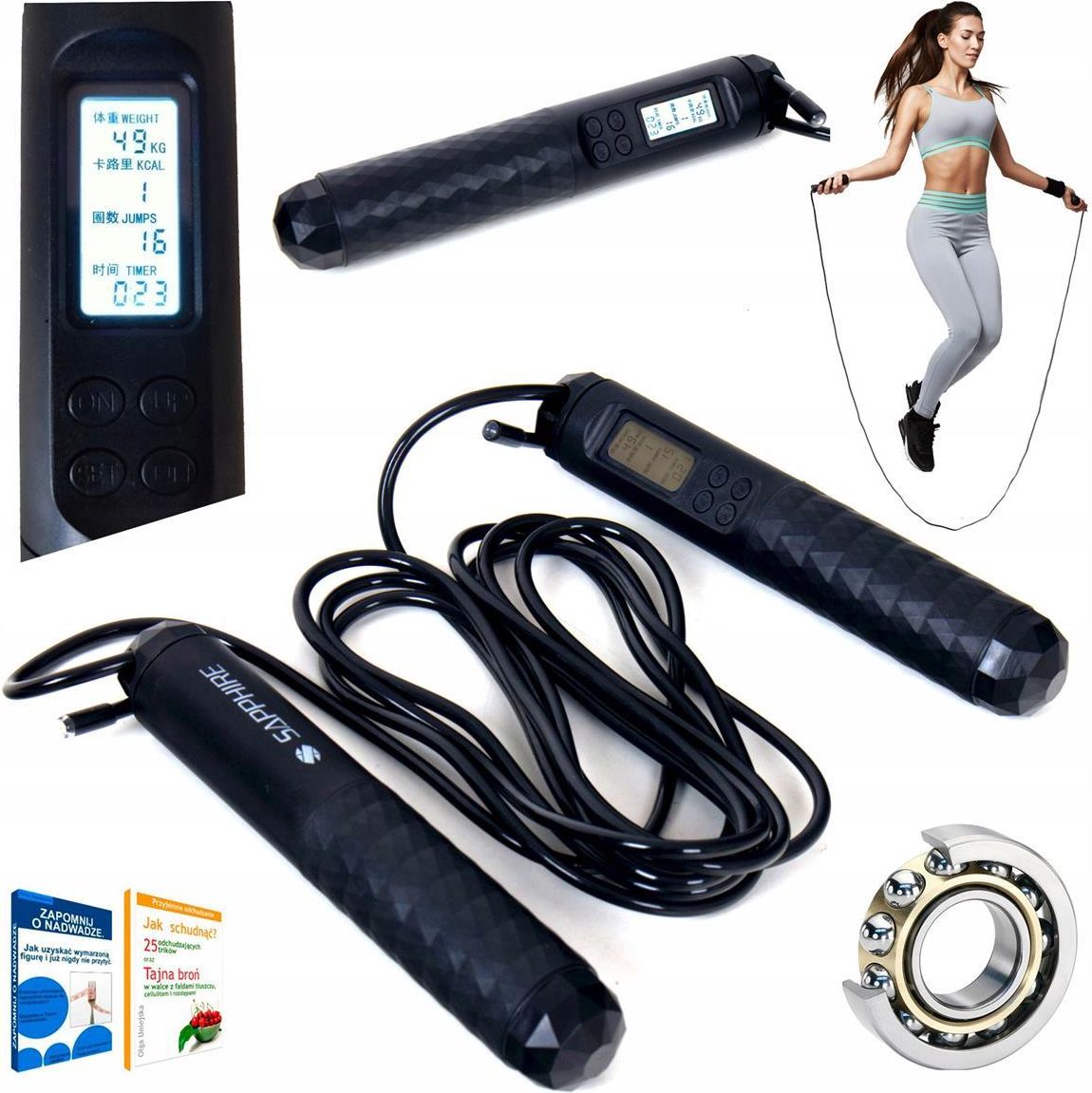Skakanka Crossfit z licznikiem Sapphire SG-064 Model: Sapphire SG-064 Kolor: Czarny Wbudowany licznik Obrotowe uchwyty z łożyskami Podświetlany wyświetlacz LCD Długość linki: 3,05m Regulacja długości linki Długość rączki: 17,5cm Nowoczesny design Klasa użytkowa: H (do użytku domowego) Wysoka jakość wykonania
