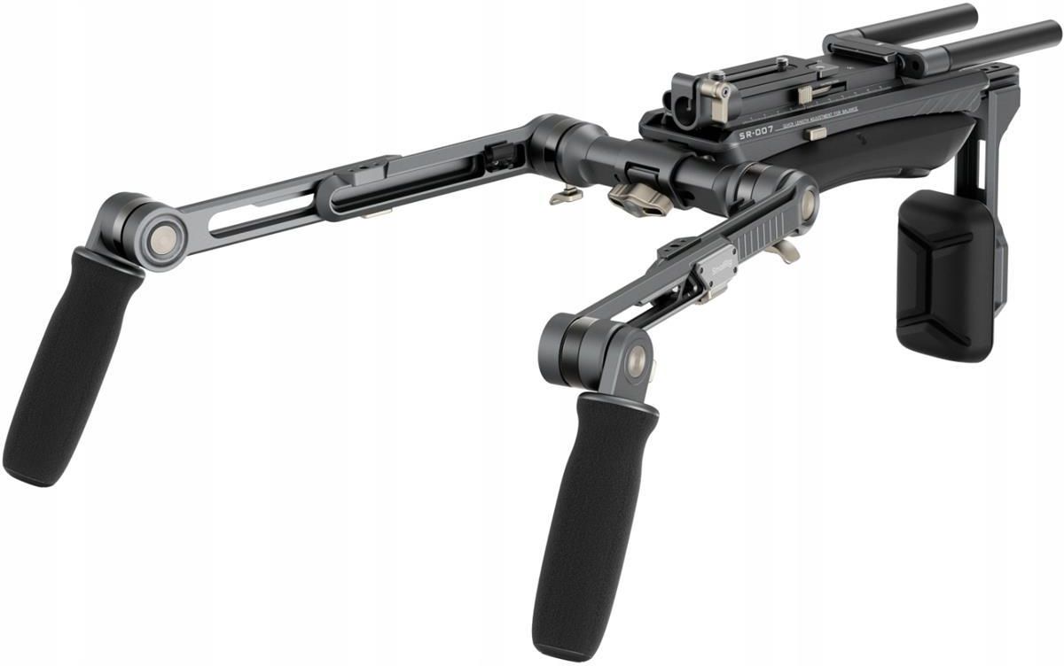 Cechy produktu szybki montaż i regulacja jednym ruchem ergonomiczna konstrukcja zmniejszająca obciążenie przesuwna płytka arca/manfrotto do mocowania kamery obrotowe uchwyty 360° z miękkimi gripami miękka podkładka tylna z regulacją do 90° gwinty 1/4"-20 na ramionach i tylnej części, rozetka uchwyt na pręty 15 mm z dwoma krótkimi prętami Shoulder Rig SR007 Pro [4181] Profesjonalny rig naramienny SmallRig SR007 HawkLock SmallRig SR007 HawkLock Shoulder Rig Pro zapewnia pełną wygodę i intuicyjną obsługę podczas nagrywania z ręki kamerą bezlusterkową lub kompaktową kamerą filmową. Dzięki składanemu centralnemu plate’owi i ramionom rig można szybko rozłożyć i złożyć jednym ruchem Modularna płytka szybkozłączki Kamera mocowana jest na kombinowanej szybkozłączce Arca/Manfrotto, co pozwala na błyskawiczne przełączanie między trybem ręcznym, naramiennym i statywowym. Płytka może się przesuwać do 9,9 cm, co ułatwia precyzyjne wyważenie zestawu. Regulowane ramiona przedłużające Ramiona regulowane są dzięki systemowi SmallRig HawkLock, który gwarantuje ich stabilne blokowanie. Można je obracać w zakresie 360°, regulować szerokość w zakresie 5 cm oraz pochylać na boki do 12°, co pozwala na idealne dopasowanie do użytkownika. Miękkie, wygodne uchwyty zapewniają komfort nawet podczas długiego użytkowania. Opcje rozbudowy i akcesoria Rig wyposażony jest w wiele gwintów 1/4"-20 na ramionach i tylnej podkładce, odłączaną rozetę ARRI oraz uchwyt na 15-mm pręty wraz z dwoma krótkimi prętami, umożliwiając montaż dodatkowych akcesoriów. Klips na przewody zabezpiecza okablowanie, utrzymując je na swoim miejscu. Rig jest kompatybilny z modelami statywów SmallRig: 4259, 3751B, 3989, 4163, 4259, 4287, 4420, 4465, 4643 i 4686. Regulowana podkładka tylna Podkładka tylna obraca się do 90° i umożliwia regulację w pionie oraz poziomie, co zapewnia komfort i odpowiednie wsparcie przy długich nagraniach. W porównaniu do wcześniejszych uniwersalnych rigów naramiennych, lepsze rozłożenie ciężaru i większa stabilność zmniejszają obciążenie dla użytkownika. Miękkie podkładki naramienne i tylne mocowane są na rzepy, co ułatwia ich regulację. Zestaw zawiera smallrig sr007 hawklock shoulder rig pro szybkozłączka manfrotto/arca podkładka tylna uchwyt na pręty 15 mm adapter na pręty 15 mm 2 × pręt 15 mm (śruba 1/4"-20) rozetka w stylu arri 4 × śruba m3 śruba 1/4"-20 klucz imbusowy futerał do przechowywania