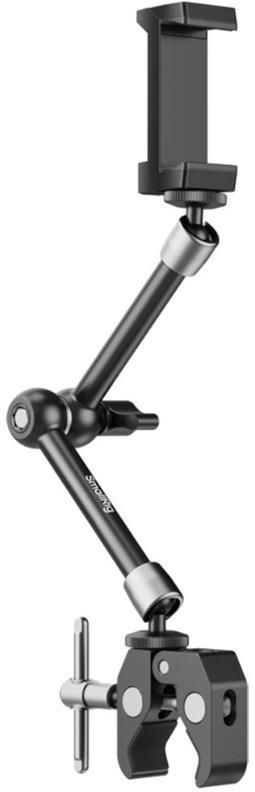 SmallRig 5326 uchwyt do telefonu z Magic Arm i zaciskiem krabowymCharakterystyka Wszechstronność i możliwość rozbudowy dzięki otworom gwintowanym 1/4„-20 i śrubom 1/4”-20 zapewniając kompatybilność z szeroką gamą akcesoriów. Obrotowa końcówka zwiększa powierzchnię styku, zapewniając bardziej stabilne mocowanie. Zawiera zacisk do smartfona, idealny do fotografowania wieloma urządzeniami. SmallRig 5326 łączy w sobie Magic Arm, super zacisk krabowy i zacisk do smartfona. Jeden koniec posiada śrubę 1/4"-20 do montażu kamer sportowych, monitorów, mikrofonów i innych akcesoriów, włąćznie z dołączonym uchwytem na smartfon, podczas gdy drugi koniec można zacisnąć na rurach, stołach, nogach statywu dzięki szerokiemu zakresowi otwarcia zacisku krabowego w zakresie od 14 do 50 mm. Bezpieczne połączeniePołączenie między Magic Arm i klamrą krabową ma konstrukcję zapobiegającą poluzowaniu i odłączeniu podczas pracy. Szczęki zacisku są wyłożone ochronnymi podkładkami, aby zapobiec zarysowaniom i zwiększyć stabilność. Dodatkowo produkt zawiera uchwyt na telefon, aby umożliwić korzystanie ze smartfonów podczas robienia zdjęć. Uwaga Maksymalny udźwig wynosi 1,5 kg Zawartość zestawu 1x Klamra krabowa Super Clamp 1x Magic Arm 1x Uchwyt do smartfona