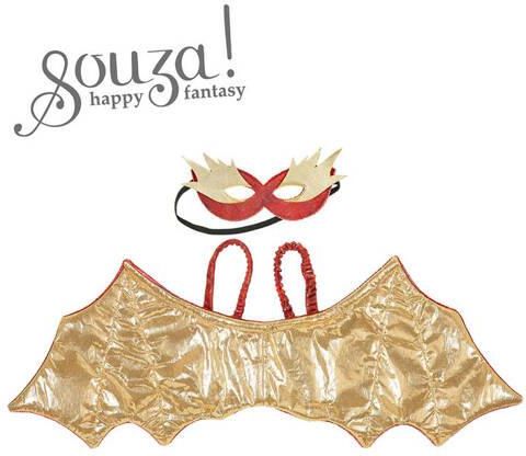 Zestaw akcesoriów: miękkie skrzydła i maska Red dragon holenderskiej marki Souza! Szerokie złote skrzydła wykonane są od spodu z fakturowanej czerwonej tkaniny, imitującej smoczą skórę. Czerwona maska ma złote aplikacje ogników. Cechy: - szerokość skrzydeł: 25 cm - starannie wykonane z dbałością o …