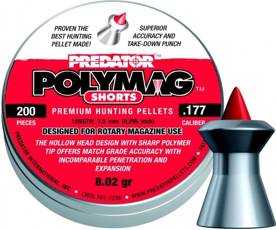 Śrut ołowiany Predator PolyMag Shorts kaliber 4,5 mm jest produkowany przez firmę JSB, która dostarcza swoje produkty do 45 krajów na całym świecie. Ich produkty są bardzo popularne wśród profesjonalnych strzelców, ekspertów w tej dziedzinie lub entuzjastów karabinów pneumatycznych. Śrut posiada polimerową końcówkę, która zapewnia bezproblemową penetrację celu. Diabolas charakteryzuje się wysoką celnością i jakością. Waga: 0,520 g Opakowanie: 200 sztuk Średnica: 4.500