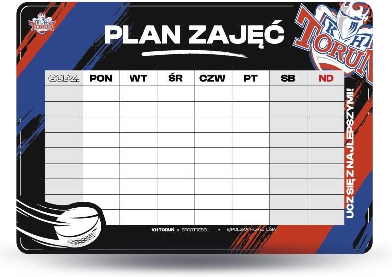 Plan zajęć KHT Toruń Ucz się z najlepszymi! Każdy dzień szkolny z nutą hokejowej pasji? Z planem zajęć KHT Toruń to możliwe! To idealna propozycja dla młodych fanów hokeja, którzy chcą mieć swoje obowiązki pod kontrolą – i to w barwach ulubionego klubu. Główne cechy: Oficjalny gadżet KHT Toruń: Ozdobiony herbem klubu i barwami klubowymi – kibicowska duma w każdej klasie. Przejrzysty układ: Tydzień rozpisany na wszystkie dni, od poniedziałku do niedzieli, z miejscem na godziny. Motywujący slogan: „Ucz się z najlepszymi!” – bo nauka może iść w parze z pasją do sportu. Trwały i estetyczny: Wysokiej jakości nadruk i solidne wykonanie sprawiają, że plan przetrwa cały sezon. Wymiary: 21 x 29.7 cm Zaplanuj zajęcia szkolne i kibicuj KHT Toruń codziennie – nawet w szkole!