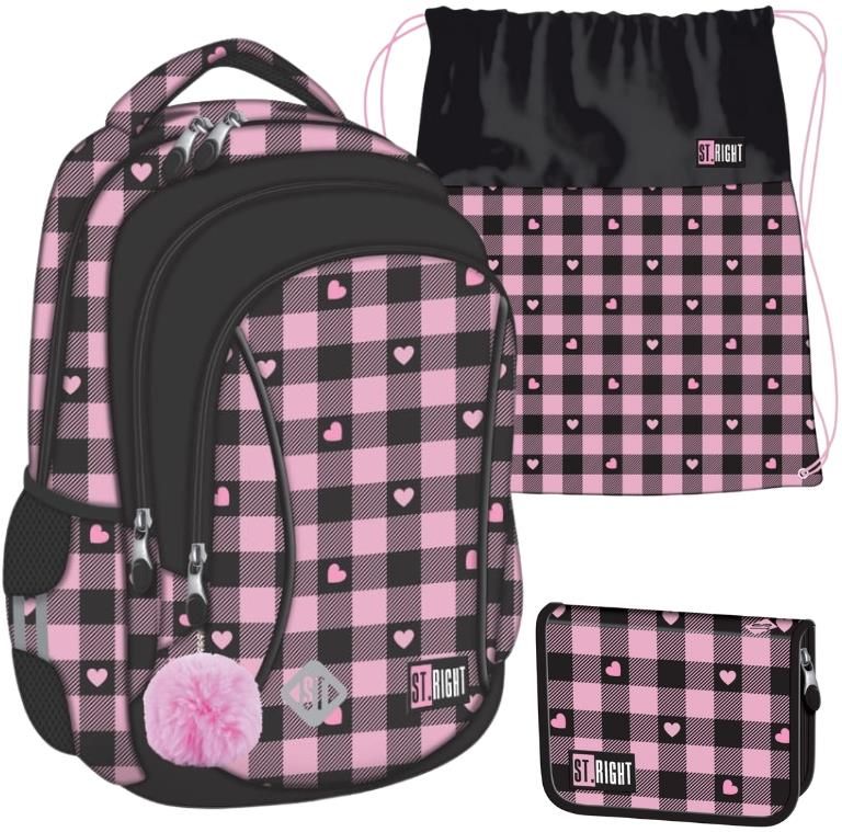 {col/50/} Zestaw Szkolny St. Right Plecak Trzykomorowy + Worek + Piórnik Dwuklapkowy Bez Wyposażenia Producent: St. Right Motyw: Pink Checkered Wymiary plecaka: 39 x 27 x 17 cm Pojemność plecaka: 20 litrów Liczba komór w plecaku: 3, kieszeni bocznych: 2 Wymiary worka: 43 x 34 cm Zamknięcie worka: …