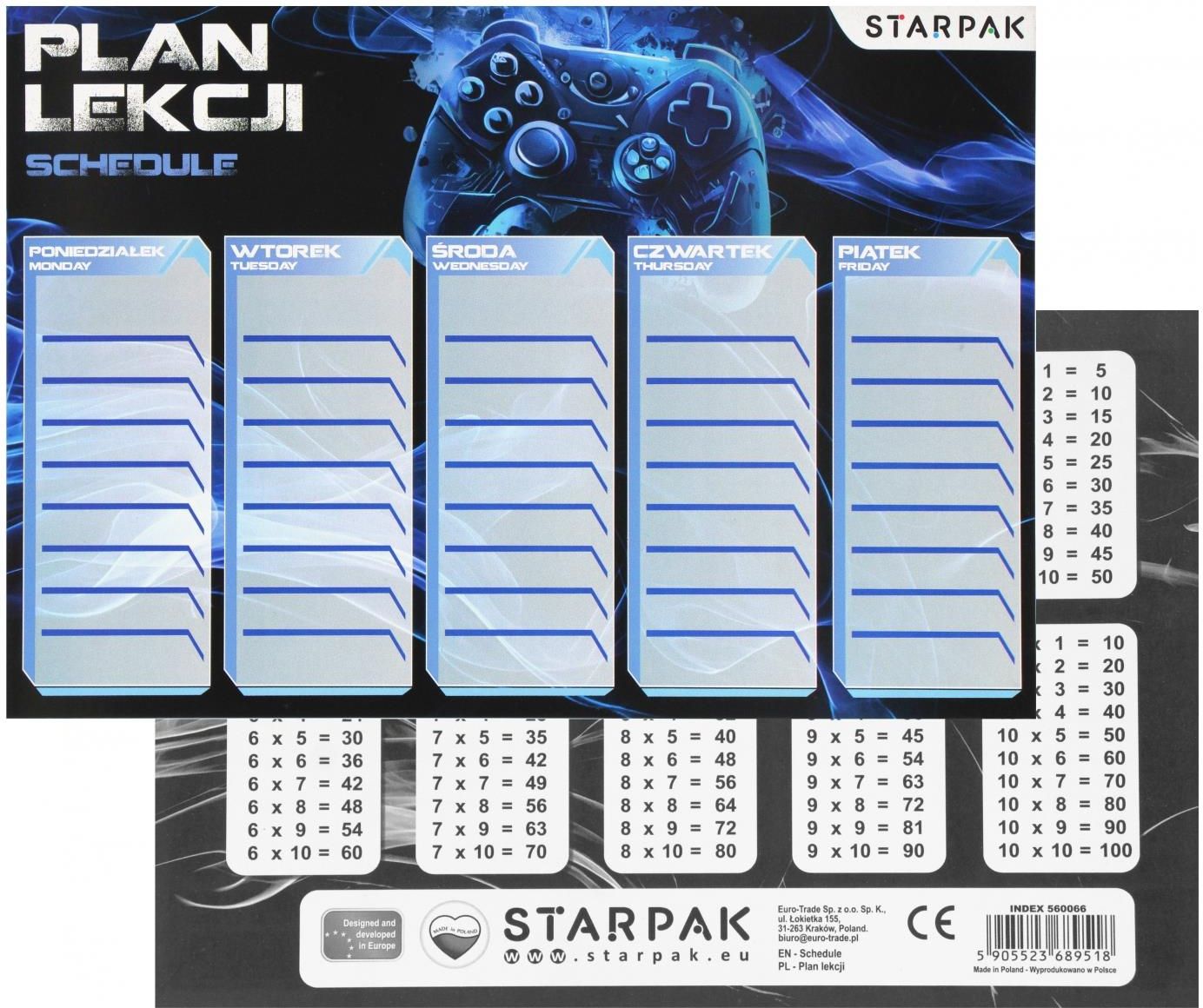 Starpak Plan Lekcji z Tabliczką Mnożenia A5 Gaming 560066 Plan lekcji jest niezbędnym elementem wyposażenia szkolnej wyprawki. Plan z kolekcji Gaming zawiera podział na pięć dni tygodnia z 8 wierszami do wpisu, dzięki czemu żaden uczeń nie zapomni o potrzebnych mu danego dnia książkach czy zeszytach, dodatkowo na odwrotnej stronie posiada tabliczkę mnożenia. Przyjazna grafika sprawi, że każdy dzień w szkole będzie dobrze zaplanowany i udany. Plan lekcji wykonany z papieru. Wyprodukowany w Polsce. wymiary produktu - 23x16 cm
