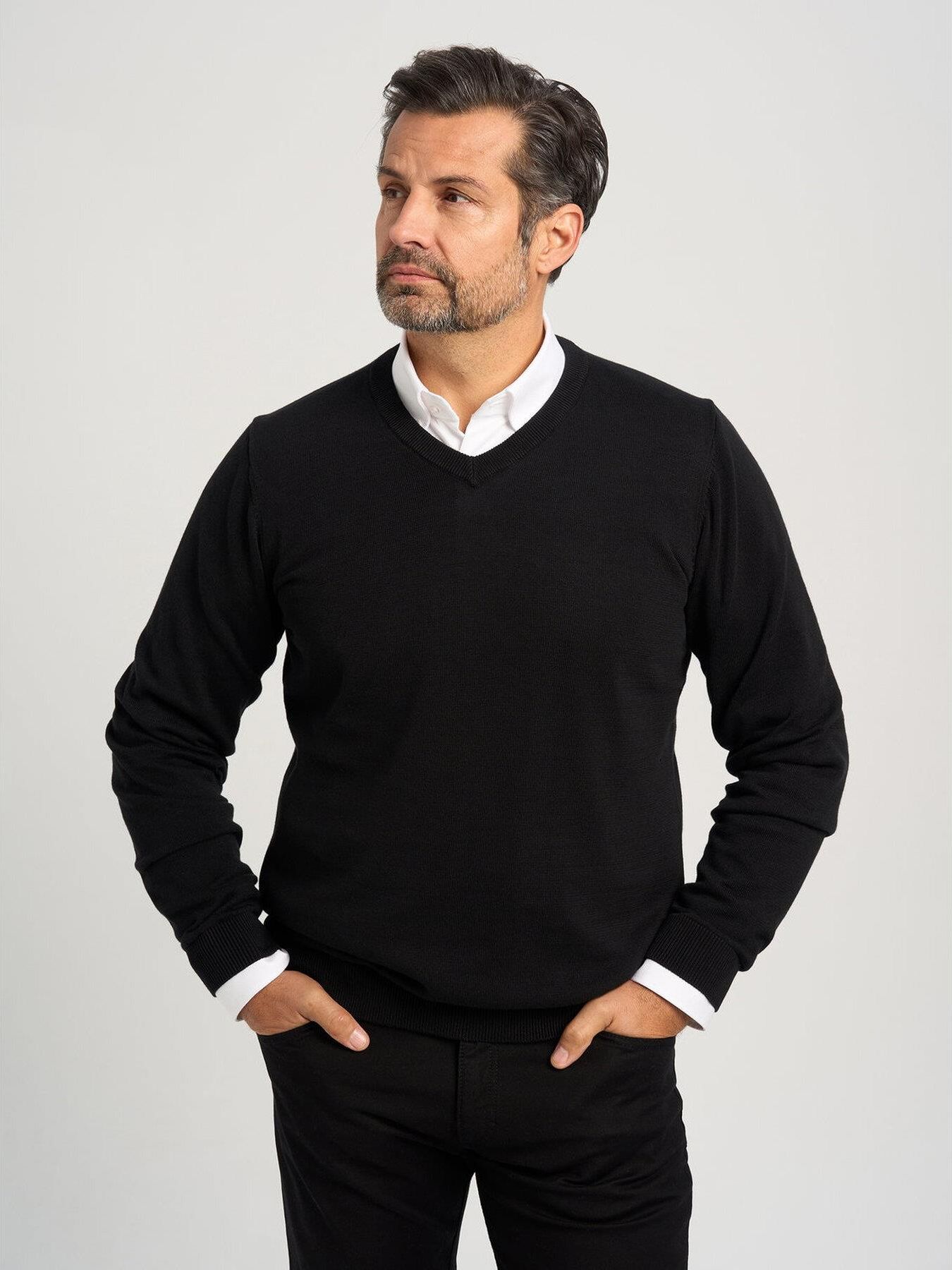 Cienki, czarny sweter z dekoltem w szpic, 100% bawełny