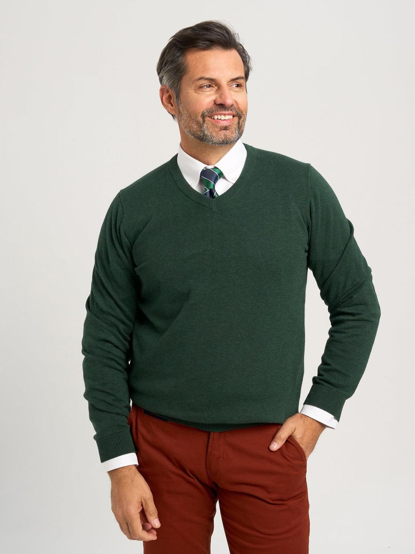 Cienki, ciemnozielony sweter z dekoltem w szpic, 100% bawełny