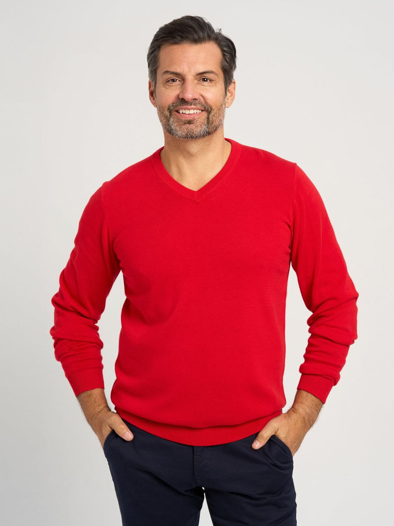 Cienki, czerwony sweter z dekoltem w szpic, 100% bawełny