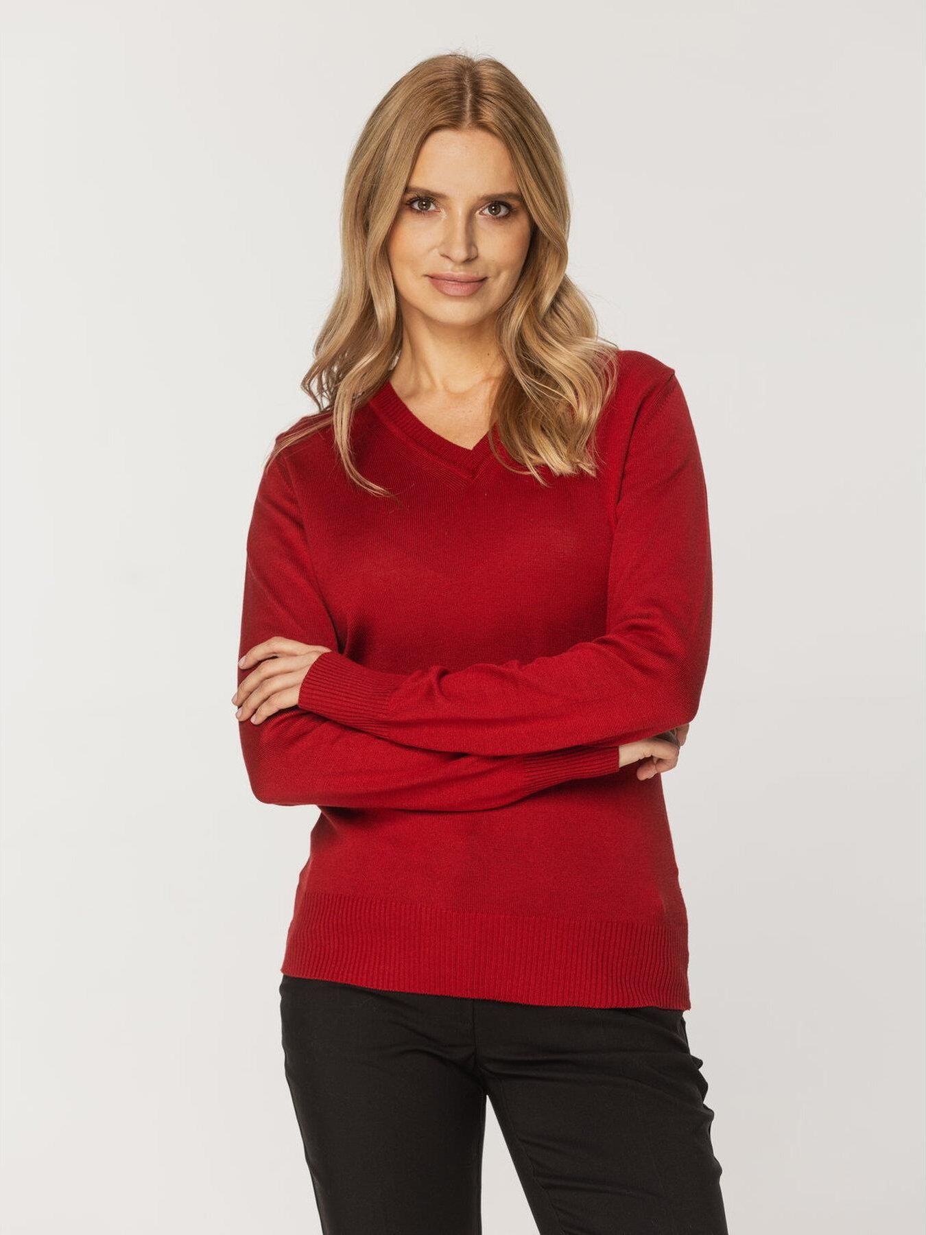 Klasyczny, bordowy sweter damski o gładkiej fakturze z dekoltem V-neck