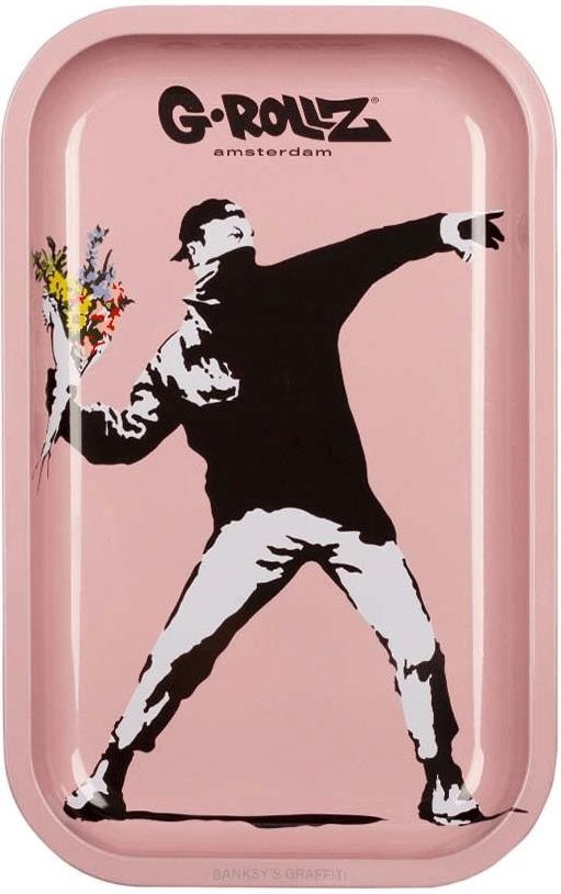 Tacka do skręcania G-Rollz Banksy Flower Thrower Pink 17.5 x 27.5 cm Tacka do jointów G-Rollz z grafiką Flower Thrower autorstwa Banksy. Wykonana z metalu. Limitowana kolekcja - każda tacka posiada indywidualny kod autentyczności. Tacka ułatwia skręcanie, podwyższone brzegi zapobiegają wysypywaniu się suszu.